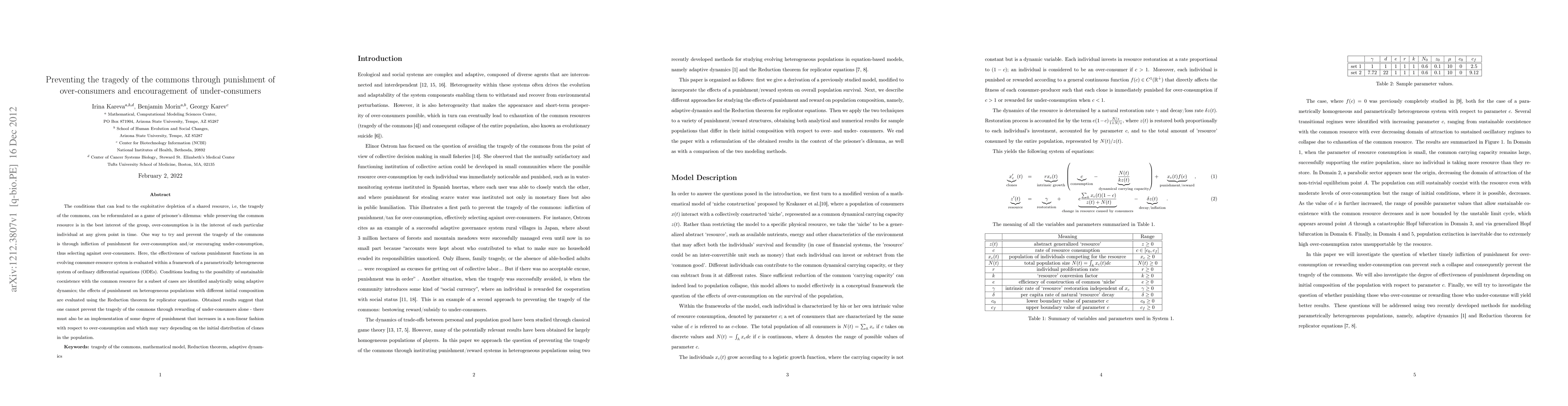 This paper explores preventing the tragedy of the commons through a combination of punishment for over-consumers and encouragement of under-consumers, using a game-theoretic framework and mathematical models. It finds that while rewarding under-consumers alone is insufficient, a non-linearly increasing punishment for over-consumers, coupled with initial population composition, can help sustain the common resource.