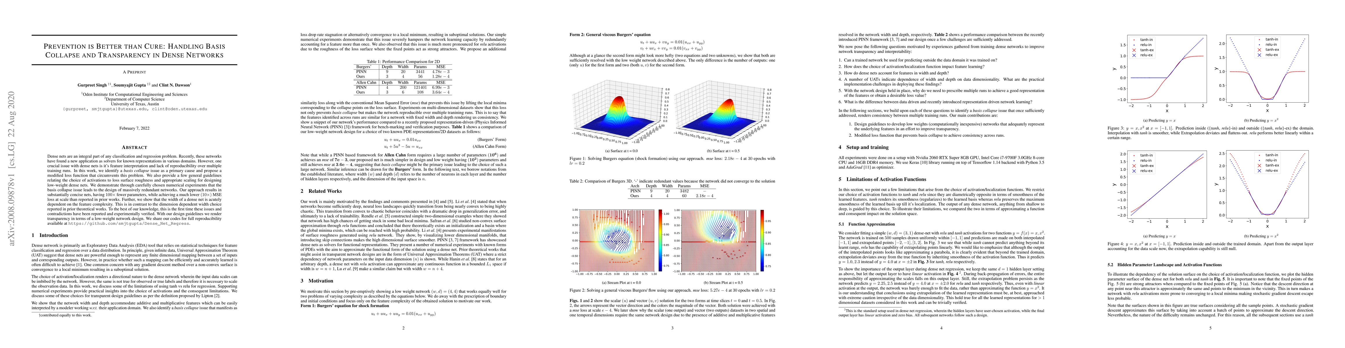 Dense nets are an integral part of any classification and regression problem. Recently, these networks have found a new application as solvers for known representations in various domains. However, one crucial issue with dense nets is it's feature interpretation and lack of reproducibility over multiple training runs. In this work, we identify a basis collapse issue as a primary cause and propose a modified loss function that circumvents this problem. We also provide a few general guidelines relating the choice of activations to loss surface roughness and appropriate scaling for designing low-weight dense nets. We demonstrate through carefully chosen numerical experiments that the basis collapse issue leads to the design of massively redundant networks. Our approach results in substantially concise nets, having $100 \times$ fewer parameters, while achieving a much lower $(10\times)$ MSE loss at scale than reported in prior works. Further, we show that the width of a dense net is acutely dependent on the feature complexity. This is in contrast to the dimension dependent width choice reported in prior theoretical works. To the best of our knowledge, this is the first time these issues and contradictions have been reported and experimentally verified. With our design guidelines we render transparency in terms of a low-weight network design. We share our codes for full reproducibility available at https://github.com/smjtgupta/Dense_Net_Regress.