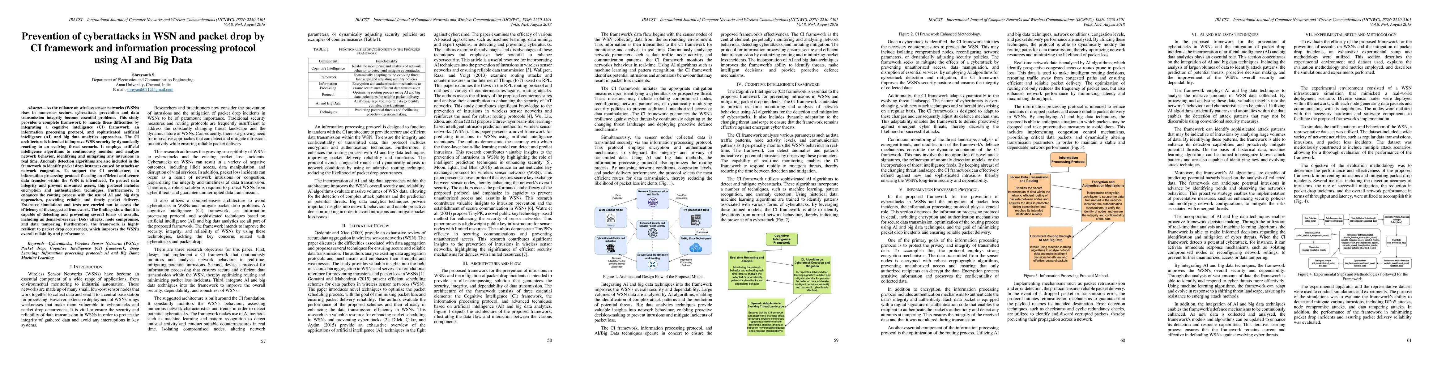 As the reliance on wireless sensor networks (WSNs) rises in numerous sectors, cyberattack prevention and data transmission integrity become essential problems. This study provides a complete framework to handle these difficulties by integrating a cognitive intelligence (CI) framework, an information processing protocol, and sophisticated artificial intelligence (AI) and big data analytics approaches. The CI architecture is intended to improve WSN security by dynamically reacting to an evolving threat scenario. It employs artificial intelligence algorithms to continuously monitor and analyze network behavior, identifying and mitigating any intrusions in real time. Anomaly detection algorithms are also included in the framework to identify packet drop instances caused by attacks or network congestion. To support the CI architecture, an information processing protocol focusing on efficient and secure data transfer within the WSN is introduced. To protect data integrity and prevent unwanted access, this protocol includes encryption and authentication techniques. Furthermore, it enhances the routing process with the use of AI and big data approaches, providing reliable and timely packet delivery. Extensive simulations and tests are carried out to assess the efficiency of the suggested framework. The findings show that it is capable of detecting and preventing several forms of assaults, including as denial-of-service (DoS) attacks, node compromise, and data tampering. Furthermore, the framework is highly resilient to packet drop occurrences, which improves the WSN's overall reliability and performance