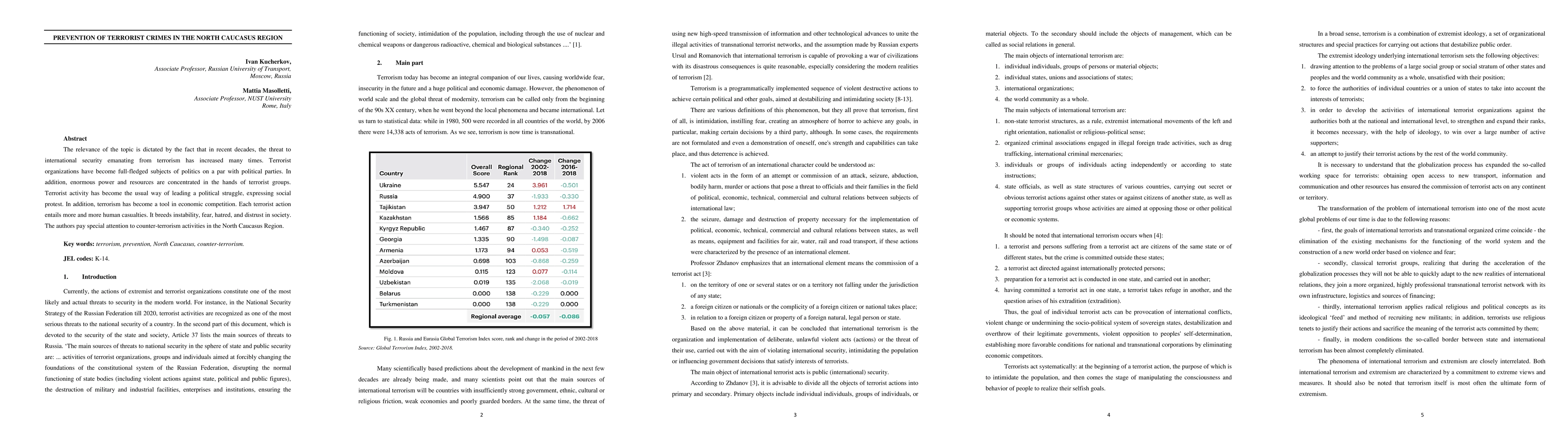 The paper underscores the growing threat of terrorism globally, with a focus on the North Caucasus. It highlights terrorism's role as a political tool and economic weapon, causing escalating human losses and societal instability. The research emphasizes counter-terrorism strategies in the North Caucasus region.