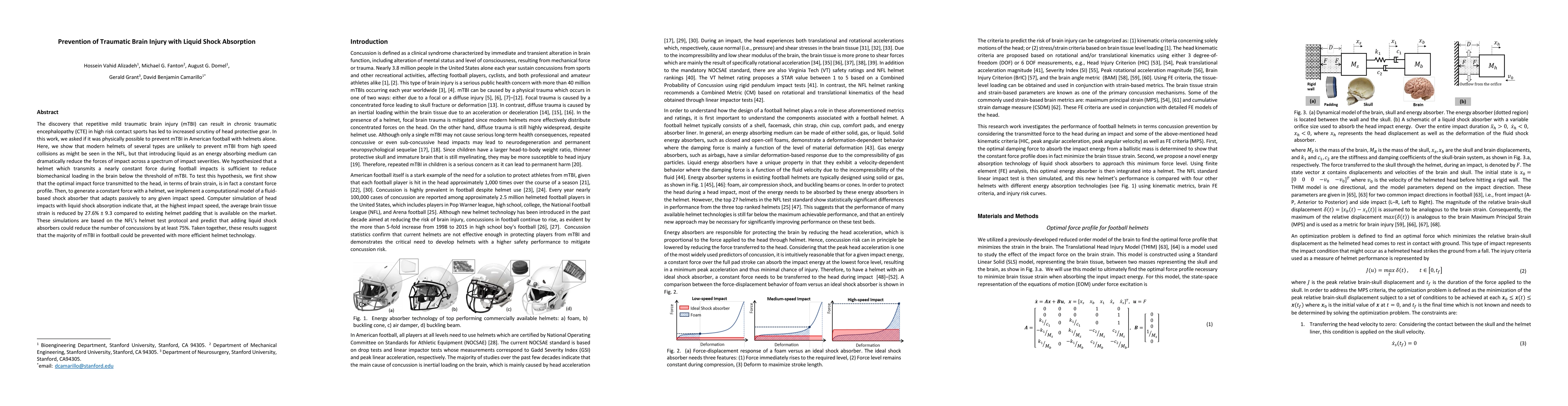 This study investigates the potential of liquid shock absorption in helmets to prevent mild traumatic brain injuries (mTBI) in American football. Simulations show that liquid-based shock absorbers can reduce brain tissue strain by 27.6% compared to existing helmet padding, suggesting a 75% reduction in concussions and indicating that advanced helmet technology could significantly lower mTBI rates.