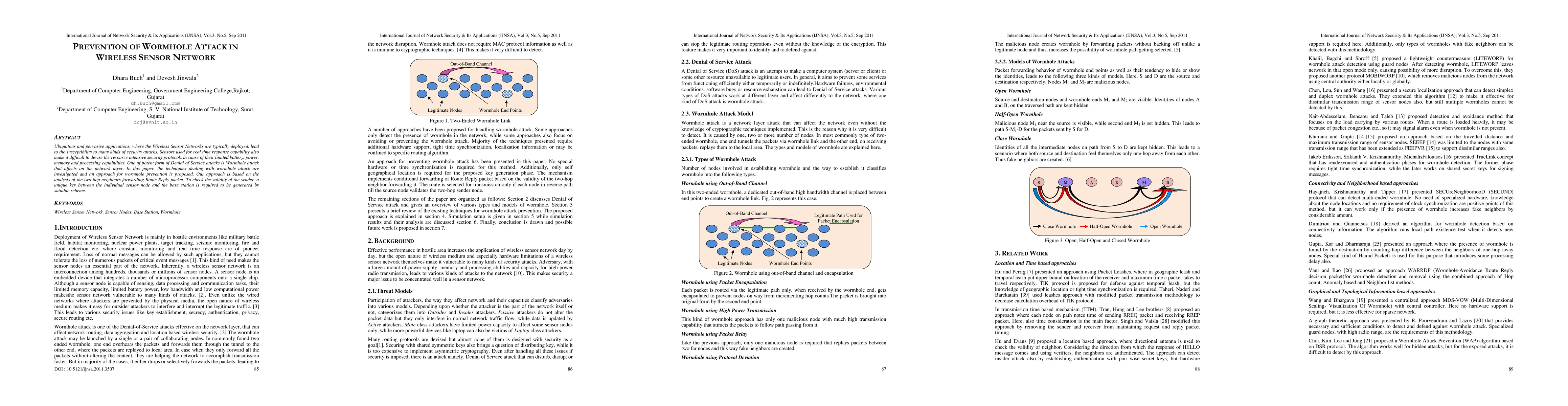 The paper proposes a wormhole prevention approach in Wireless Sensor Networks (WSNs) that checks the validity of two-hop neighbor nodes forwarding Route Reply (RREP) packets using unique keys between individual sensor nodes and the base station.