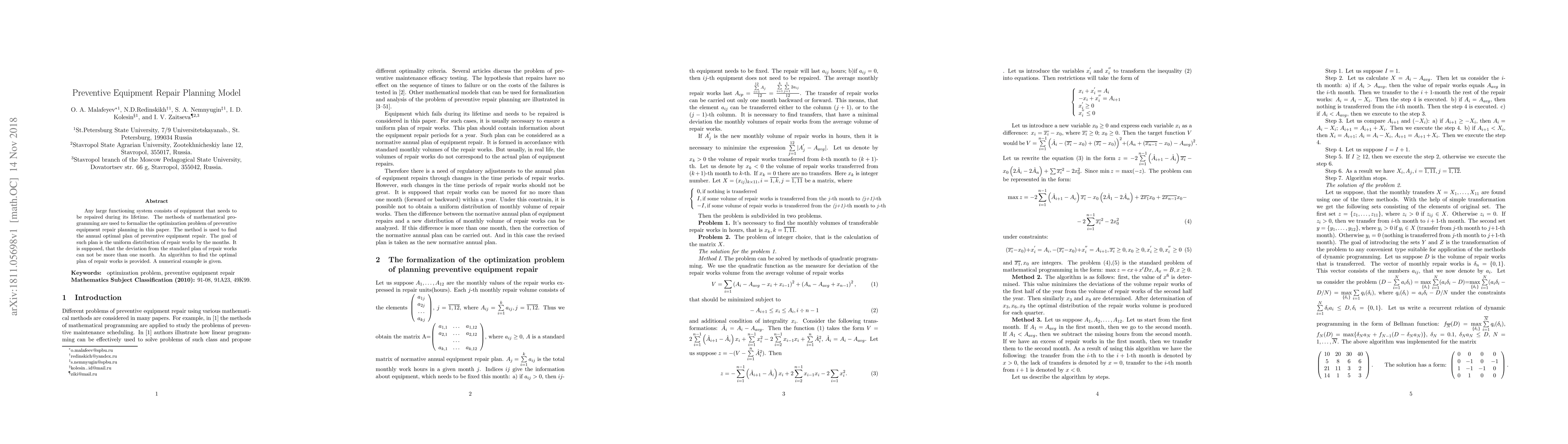 Any large functioning system consists of equipment that needs to be repaired during its lifetime. The methods of mathematical programming are used to formalize the optimization problem of preventive equipment repair planning in this paper. The method is used to find the annual optimal plan of preventive equipment repair. The goal of such plan is the uniform distribution of repair works by the months. It is supposed, that the deviation from the standard plan of repair works can not be more than one month. An algorithm to find the optimal plan of repair works is provided. A numerical example is given.