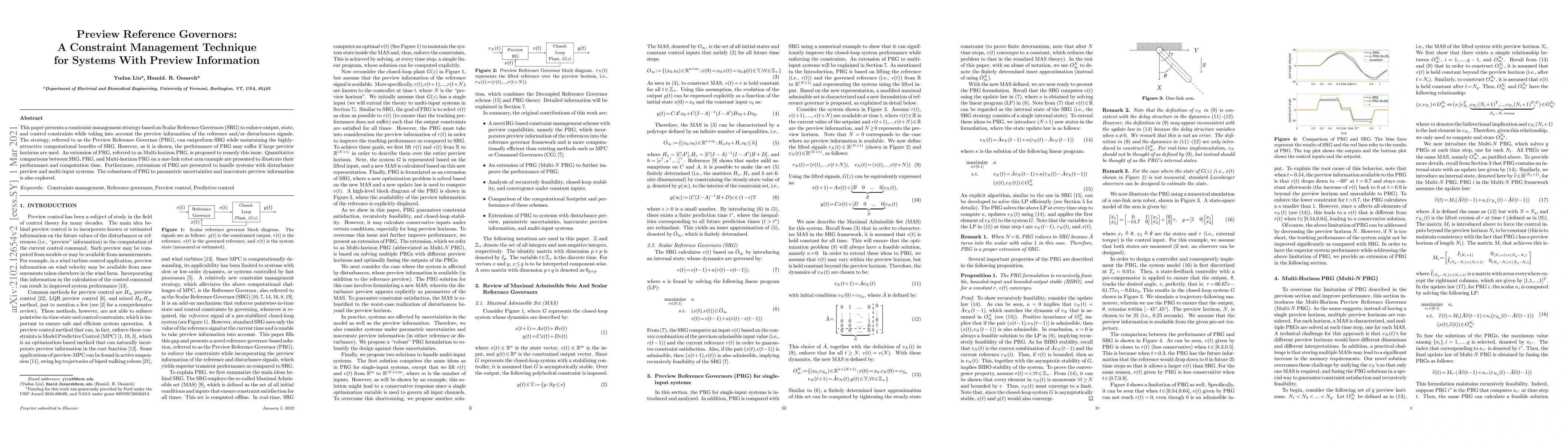 This paper introduces the Preview Reference Governor (PRG) for enforcing constraints in systems with preview information, showing it can outperform traditional Scalar Reference Governor (SRG) while maintaining computational benefits. An extended Multi-horizon PRG addresses performance issues with large preview horizons, and comparisons on a robot arm example demonstrate its effectiveness.