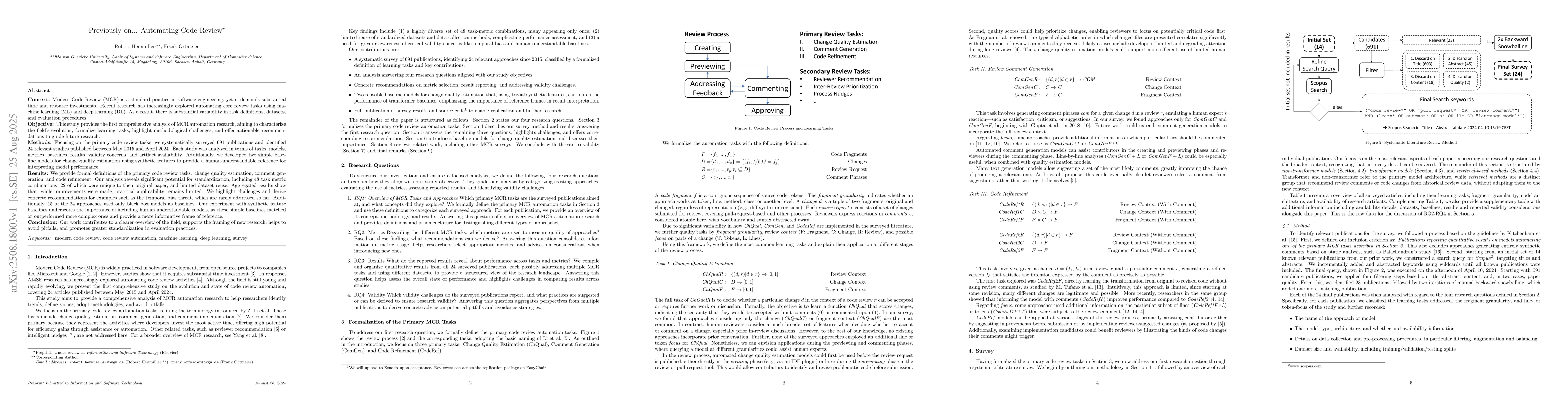 Modern Code Review (MCR) is a standard practice in software engineering, yet it demands substantial time and resource investments. Recent research has increasingly explored automating core review tasks using machine learning (ML) and deep learning (DL). As a result, there is substantial variability in task definitions, datasets, and evaluation procedures. This study provides the first comprehensive analysis of MCR automation research, aiming to characterize the field's evolution, formalize learning tasks, highlight methodological challenges, and offer actionable recommendations to guide future research. Focusing on the primary code review tasks, we systematically surveyed 691 publications and identified 24 relevant studies published between May 2015 and April 2024. Each study was analyzed in terms of tasks, models, metrics, baselines, results, validity concerns, and artifact availability. In particular, our analysis reveals significant potential for standardization, including 48 task metric combinations, 22 of which were unique to their original paper, and limited dataset reuse. We highlight challenges and derive concrete recommendations for examples such as the temporal bias threat, which are rarely addressed so far. Our work contributes to a clearer overview of the field, supports the framing of new research, helps to avoid pitfalls, and promotes greater standardization in evaluation practices.
