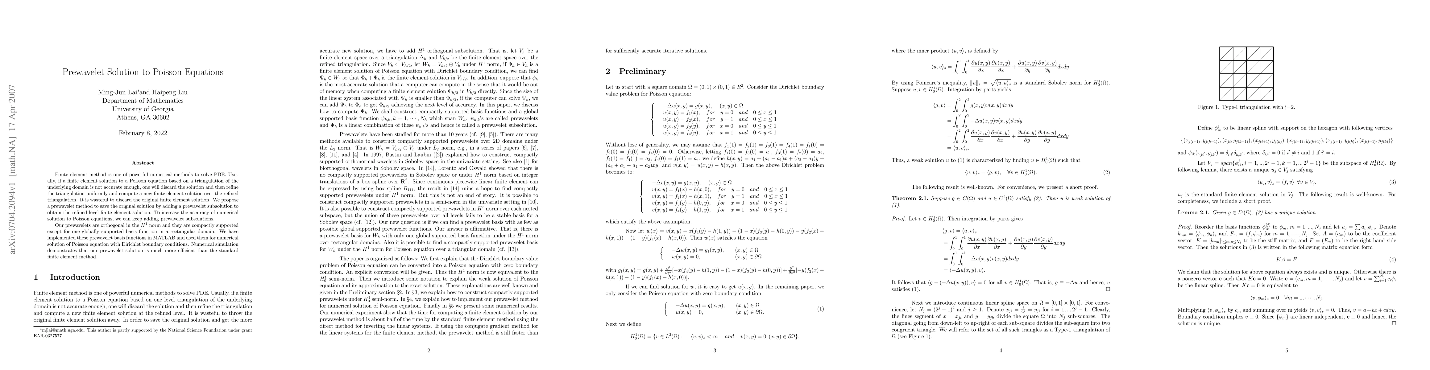 Finite element method is one of powerful numerical methods to solve PDE. Usually, if a finite element solution to a Poisson equation based on a triangulation of the underlying domain is not accurate enough, one will discard the solution and then refine the triangulation uniformly and compute a new finite element solution over the refined triangulation. It is wasteful to discard the original finite element solution. We propose a prewavelet method to save the original solution by adding a prewavelet subsolution to obtain the refined level finite element solution. To increase the accuracy of numerical solution to Poisson equations, we can keep adding prewavelet subsolutions. Our prewavelets are orthogonal in the $H^1$ norm and they are compactly supported except for one globally supported basis function in a rectangular domain. We have implemented these prewavelet basis functions in MATLAB and used them for numerical solution of Poisson equation with Dirichlet boundary conditions. Numerical simulation demonstrates that our prewavelet solution is much more efficient than the standard finite element method.