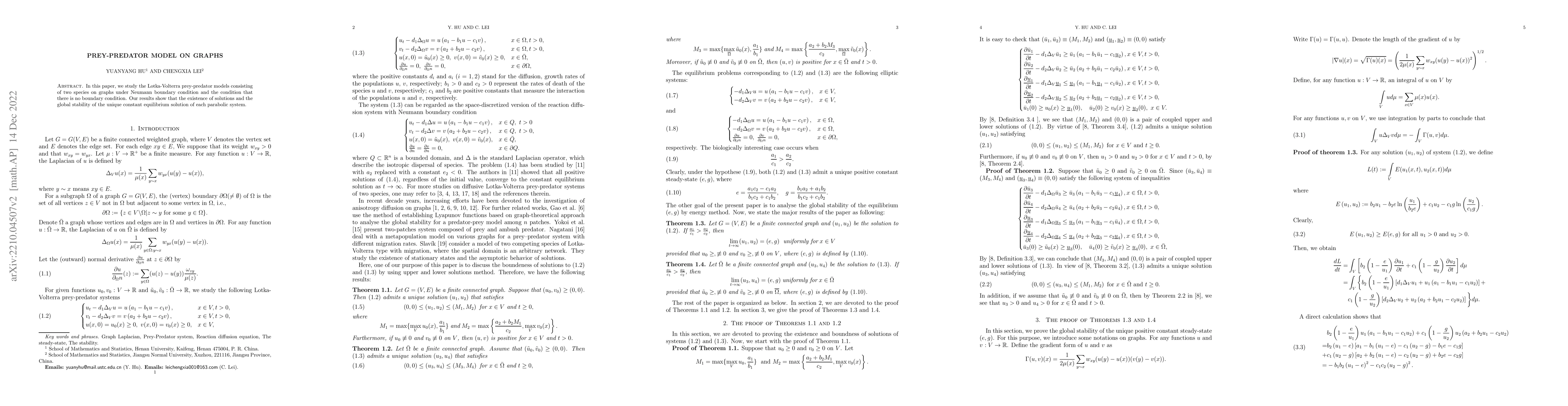 This paper investigates the Lotka-Volterra prey-predator models on finite connected graphs, establishing the global stability of the unique constant equilibrium solution under Neumann boundary conditions. The focus is on the dynamics of two species without any boundary effects.