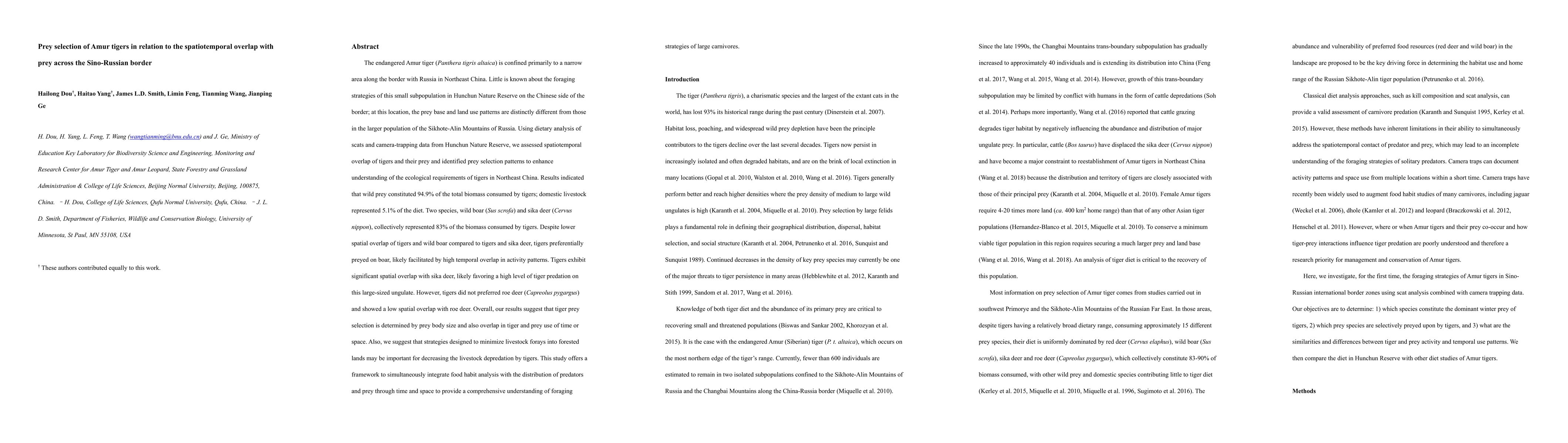 This study examines the foraging strategies of Amur tigers in Northeast China, focusing on prey selection in relation to spatiotemporal overlap with prey. The results show that tigers predominantly consume wild prey, with wild boar and sika deer making up 83% of their diet, while exhibiting a preference for boar despite lower spatial overlap due to high temporal overlap. Strategies to minimize livestock depredation are suggested.