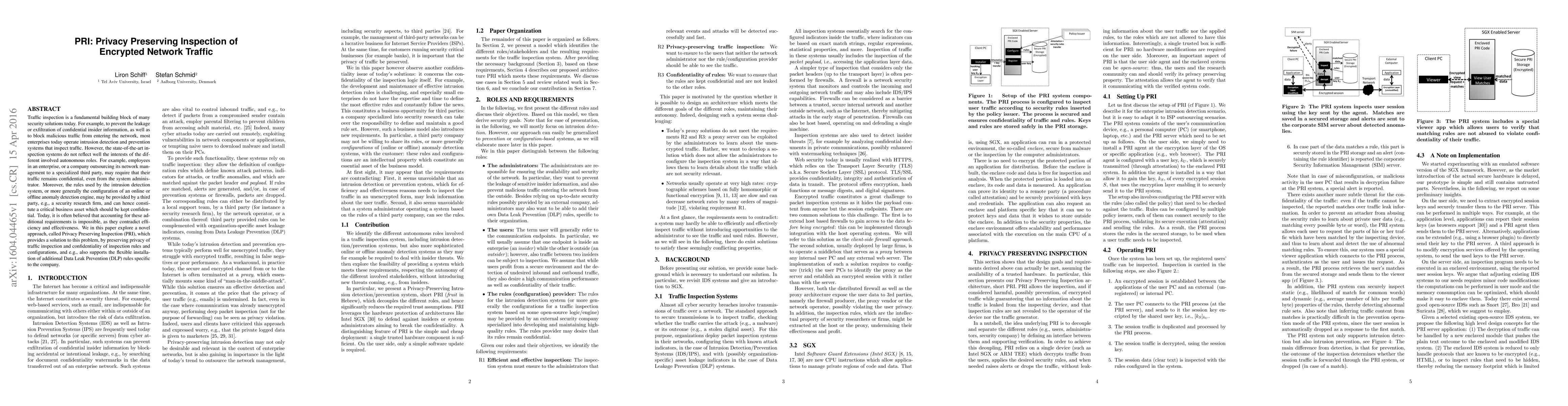 The paper introduces Privacy Preserving Inspection (PRI), a novel approach to inspect encrypted network traffic while ensuring the confidentiality of both the inspected traffic and the inspection rules, thereby addressing the conflicting requirements of efficiency, effectiveness, and privacy. PRI supports flexible implementation of company-specific Data Leak Prevention rules without compromising privacy.