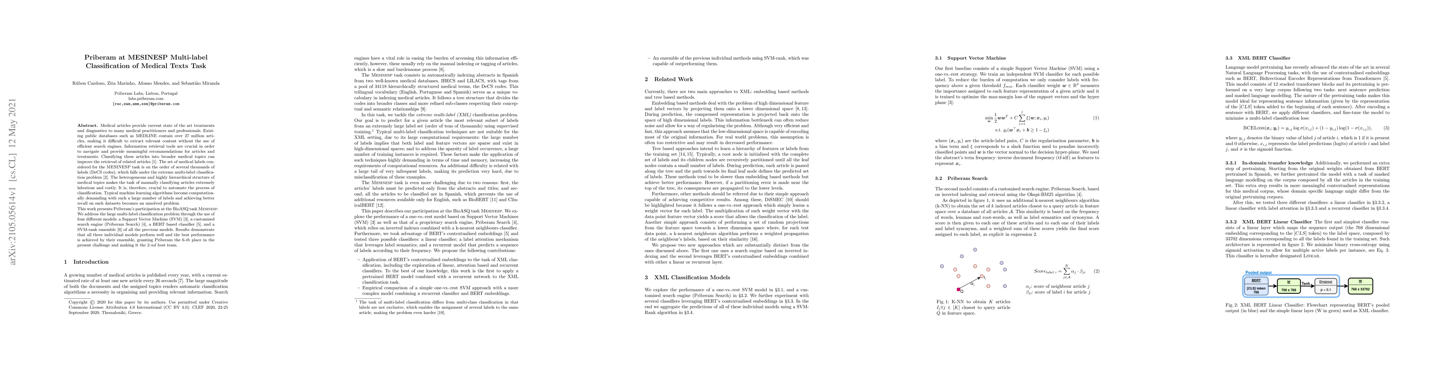 Medical articles provide current state of the art treatments and diagnostics to many medical practitioners and professionals. Existing public databases such as MEDLINE contain over 27 million articles, making it difficult to extract relevant content without the use of efficient search engines. Information retrieval tools are crucial in order to navigate and provide meaningful recommendations for articles and treatments. Classifying these articles into broader medical topics can improve the retrieval of related articles. The set of medical labels considered for the MESINESP task is on the order of several thousands of labels (DeCS codes), which falls under the extreme multi-label classification problem. The heterogeneous and highly hierarchical structure of medical topics makes the task of manually classifying articles extremely laborious and costly. It is, therefore, crucial to automate the process of classification. Typical machine learning algorithms become computationally demanding with such a large number of labels and achieving better recall on such datasets becomes an unsolved problem. This work presents Priberam's participation at the BioASQ task Mesinesp. We address the large multi-label classification problem through the use of four different models: a Support Vector Machine (SVM), a customised search engine (Priberam Search), a BERT based classifier, and a SVM-rank ensemble of all the previous models. Results demonstrate that all three individual models perform well and the best performance is achieved by their ensemble, granting Priberam the 6th place in the present challenge and making it the 2nd best team.