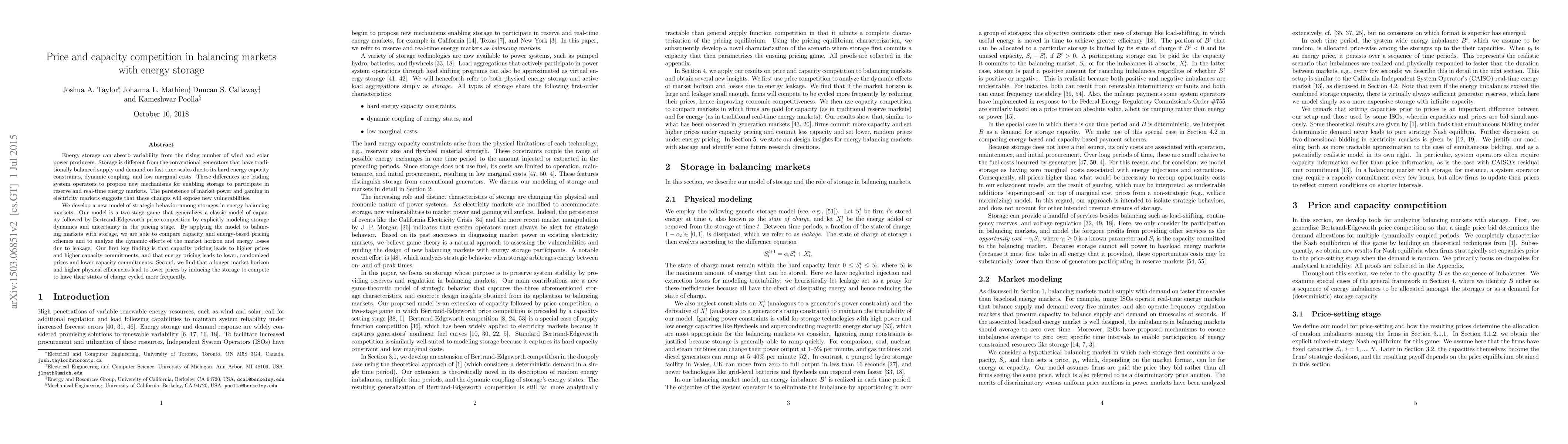 Energy storage can absorb variability from the rising number of wind and solar power producers. Storage is different from the conventional generators that have traditionally balanced supply and demand on fast time scales due to its hard energy capacity constraints, dynamic coupling, and low marginal costs. These differences are leading system operators to propose new mechanisms for enabling storage to participate in reserve and real-time energy markets. The persistence of market power and gaming in electricity markets suggests that these changes will expose new vulnerabilities. We develop a new model of strategic behavior among storages in energy balancing markets. Our model is a two-stage game that generalizes a classic model of capacity followed by Bertrand-Edgeworth price competition by explicitly modeling storage dynamics and uncertainty in the pricing stage. By applying the model to balancing markets with storage, we are able to compare capacity and energy-based pricing schemes, and to analyze the dynamic effects of the market horizon and energy losses due to leakage. Our first key finding is that capacity pricing leads to higher prices and higher capacity commitments, and that energy pricing leads to lower, randomized prices and lower capacity commitments. Second, we find that a longer market horizon and higher physical efficiencies lead to lower prices by inducing the storage to compete to have their states of charge cycled more frequently.