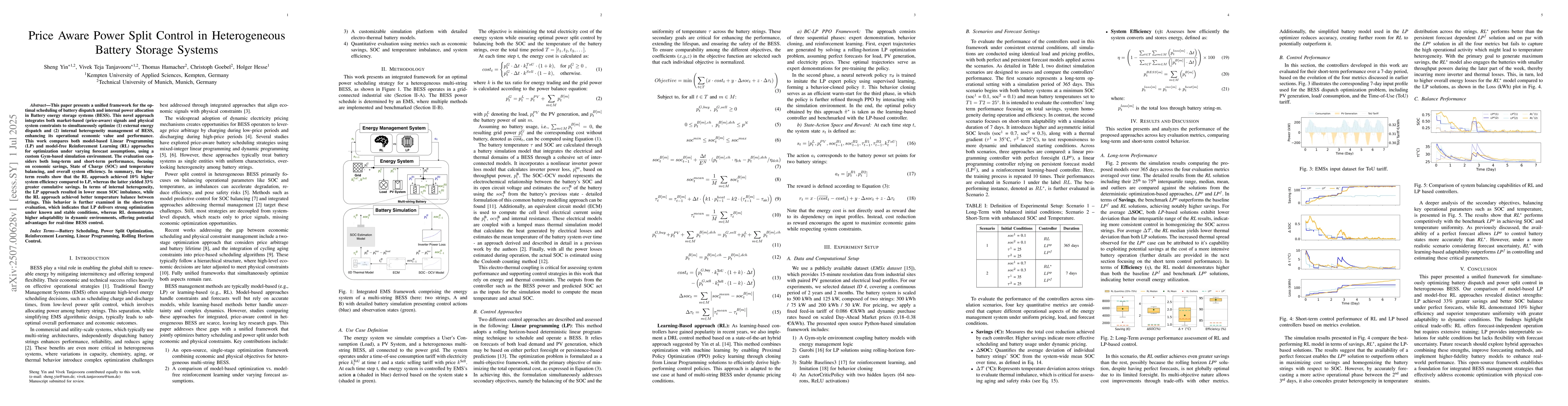 This paper presents a unified framework for the optimal scheduling of battery dispatch and internal power allocation in Battery energy storage systems (BESS). This novel approach integrates both market-based (price-aware) signals and physical system constraints to simultaneously optimize (1) external energy dispatch and (2) internal heterogeneity management of BESS, enhancing its operational economic value and performance. This work compares both model-based Linear Programming (LP) and model-free Reinforcement Learning (RL) approaches for optimization under varying forecast assumptions, using a custom Gym-based simulation environment. The evaluation considers both long-term and short-term performance, focusing on economic savings, State of Charge (SOC) and temperature balancing, and overall system efficiency. In summary, the long-term results show that the RL approach achieved 10% higher system efficiency compared to LP, whereas the latter yielded 33% greater cumulative savings. In terms of internal heterogeneity, the LP approach resulted in lower mean SOC imbalance, while the RL approach achieved better temperature balance between strings. This behavior is further examined in the short-term evaluation, which indicates that LP delivers strong optimization under known and stable conditions, whereas RL demonstrates higher adaptability in dynamic environments, offering potential advantages for real-time BESS control.