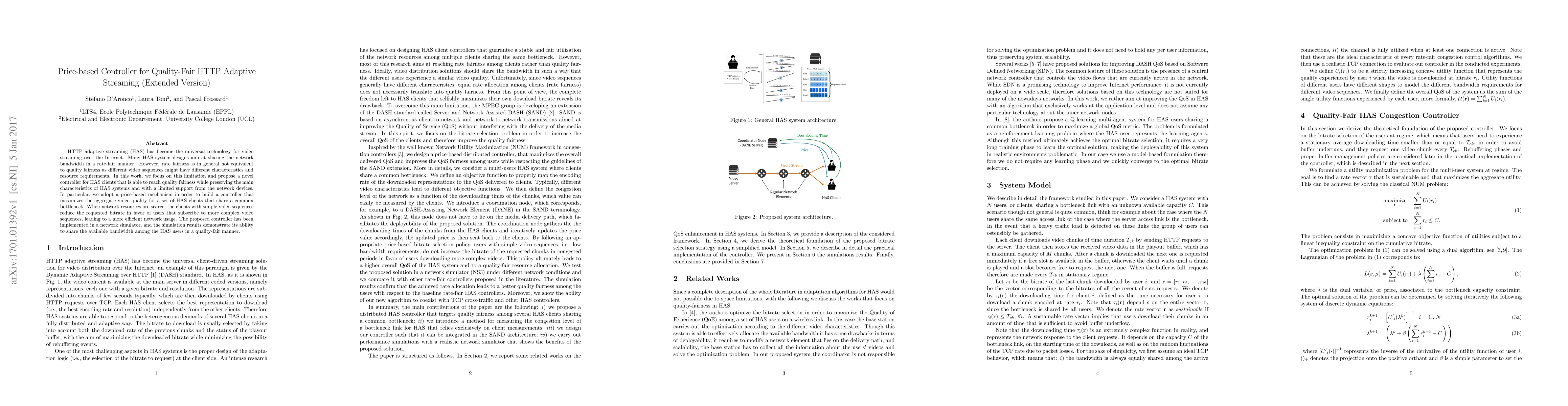 HTTP adaptive streaming (HAS) has become the universal technology for video streaming over the Internet. Many HAS system designs aim at sharing the network bandwidth in a rate-fair manner. However, rate fairness is in general not equivalent to quality fairness as different video sequences might have different characteristics and resource requirements. In this work, we focus on this limitation and propose a novel controller for HAS clients that is able to reach quality fairness while preserving the main characteristics of HAS systems and with a limited support from the network devices. In particular, we adopt a price-based mechanism in order to build a controller that maximizes the aggregate video quality for a set of HAS clients that share a common bottleneck. When network resources are scarce, the clients with simple video sequences reduce the requested bitrate in favor of users that subscribe to more complex video sequences, leading to a more efficient network usage. The proposed controller has been implemented in a network simulator, and the simulation results demonstrate its ability to share the available bandwidth among the HAS users in a quality-fair manner.