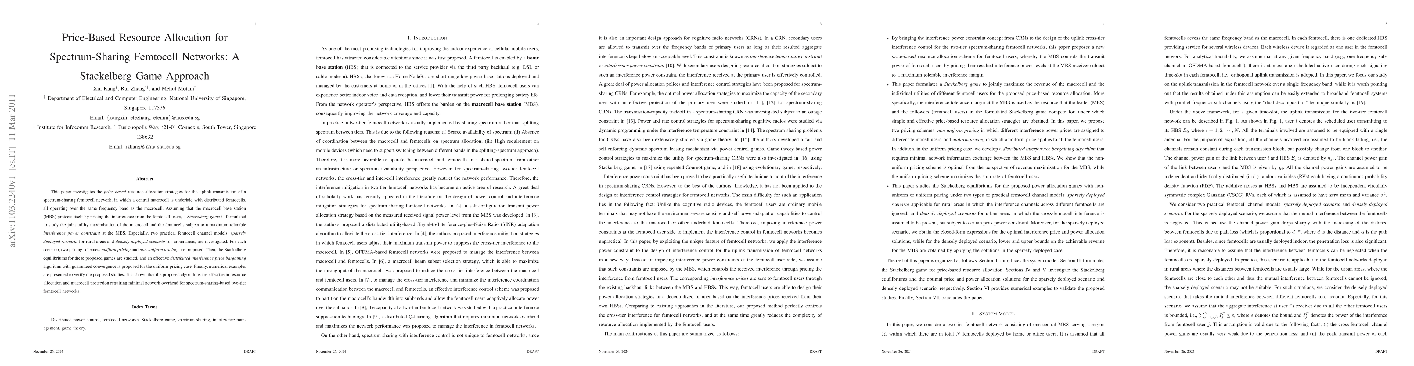 This paper proposes a Stackelberg game approach for price-based resource allocation in spectrum-sharing femtocell networks, focusing on the uplink transmission. It investigates two channel models and pricing schemes, and presents a distributed interference price bargaining algorithm with guaranteed convergence for uniform pricing.