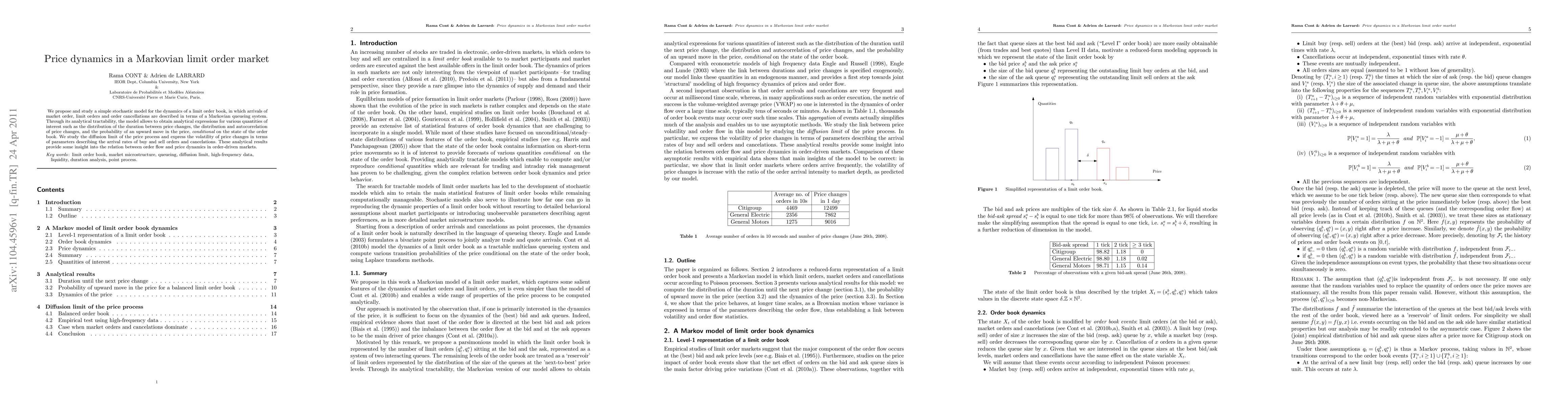 This paper develops a Markovian queueing model for limit order book dynamics, deriving analytical expressions for price change distributions and volatility. The study provides insights into how order flow influences price movements in order-driven markets.