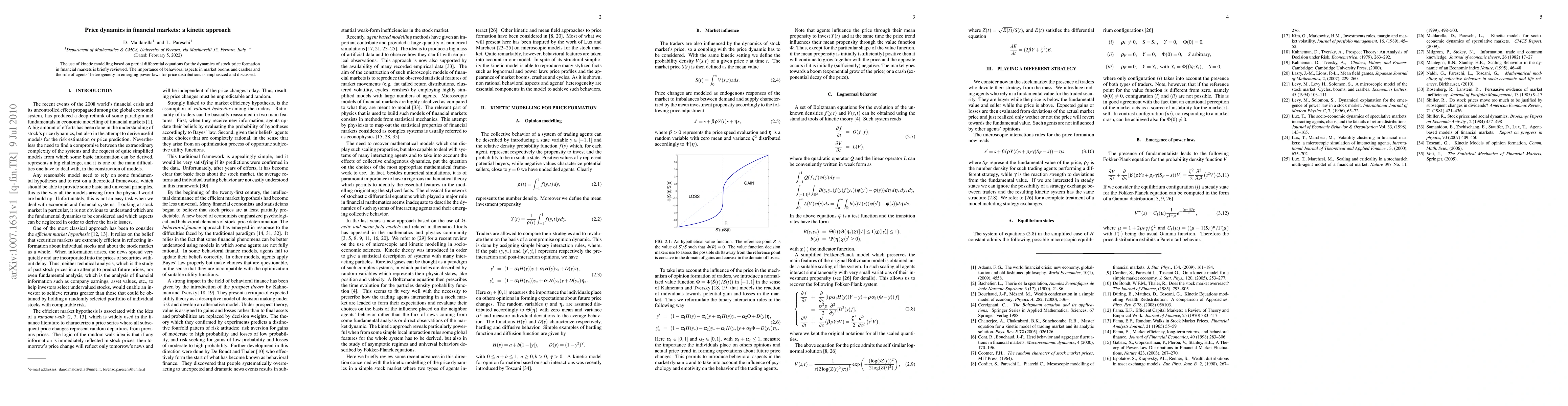 The use of kinetic modelling based on partial differential equations for the dynamics of stock price formation in financial markets is briefly reviewed. The importance of behavioral aspects in market booms and crashes and the role of agents' heterogeneity in emerging power laws for price distributions is emphasized and discussed.