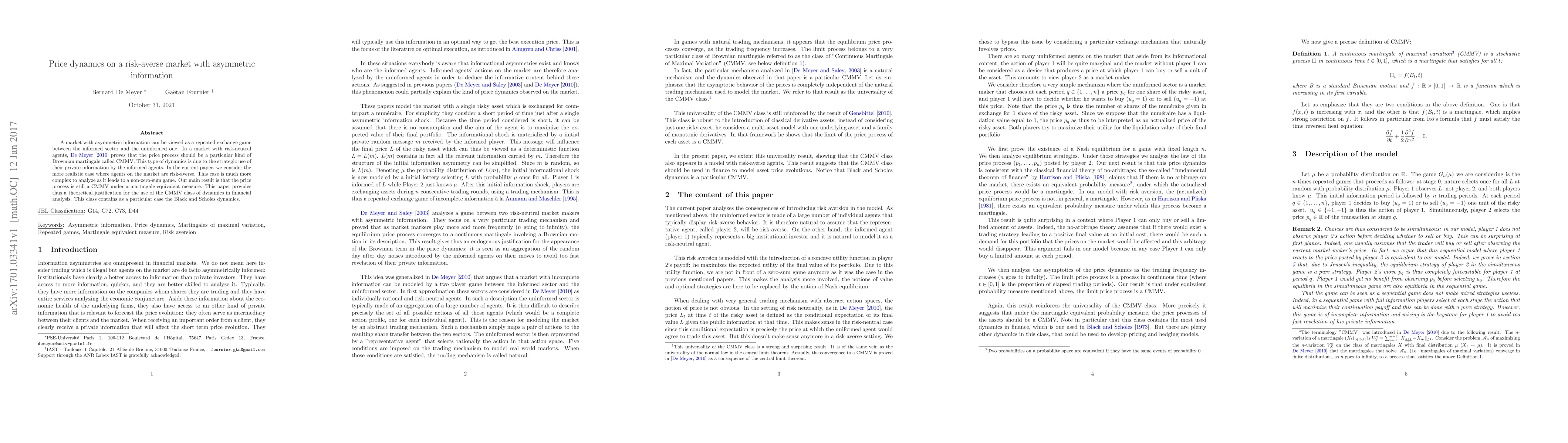 A market with asymmetric information can be viewed as a repeated exchange game between the informed sector and the uninformed one. In a market with risk-neutral agents, De Meyer [2010] proves that the price process should be a particular kind of Brownian martingale called CMMV. This type of dynamics is due to the strategic use of their private information by the informed agents. In the current paper, we consider the more realistic case where agents on the market are risk-averse. This case is much more complex to analyze as it leads to a non-zero-sum game. Our main result is that the price process is still a CMMV under a martingale equivalent measure. This paper provides thus a theoretical justification for the use of the CMMV class of dynamics in financial analysis. This class contains as a particular case the Black and Scholes dynamics.