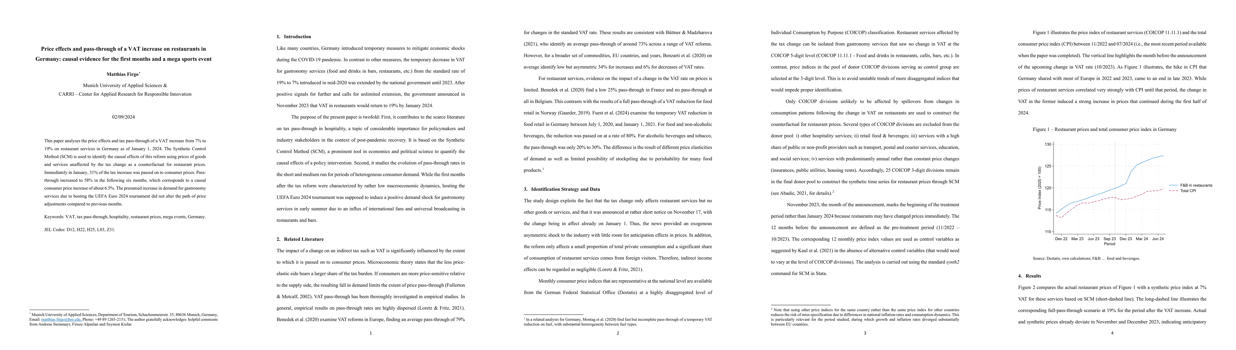 This study examines the immediate and subsequent price effects of a VAT hike from 7% to 19% on German restaurant services, finding initial pass-through at 31% that rose to 58% over six months. The hosting of UEFA Euro 2024 did not affect the price adjustment trajectory.