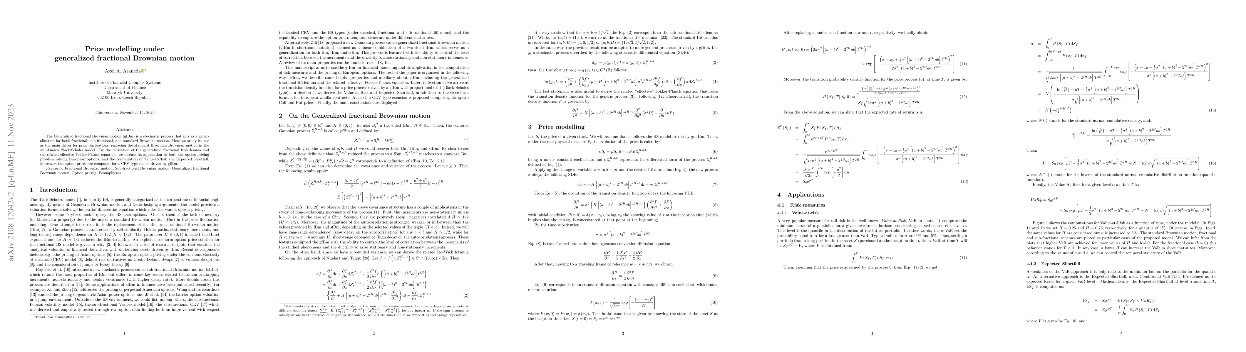 The paper presents the generalized fractional Ito's lemma and the related effective Fokker-Planck equation, which are crucial for deriving analytical pricing formulas and risk measures under gfBm.