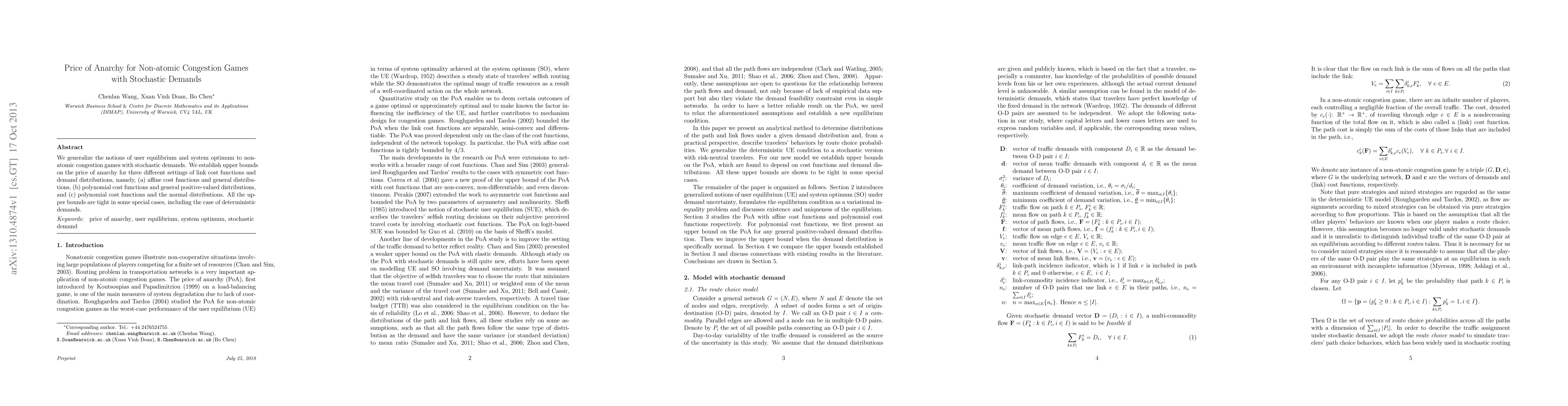 This paper generalizes user equilibrium and system optimum concepts to non-atomic congestion games with stochastic demands, establishing tight upper bounds on the price of anarchy for various link cost functions and demand distributions. The bounds are shown to be tight in specific cases, including deterministic demands.