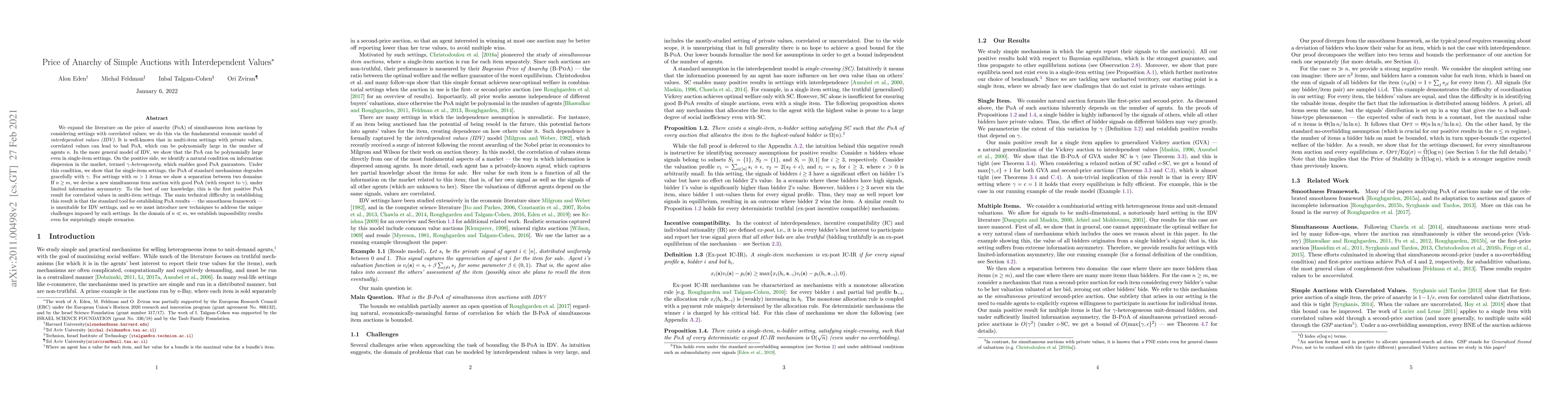 This paper investigates the price of anarchy (PoA) in auctions with interdependent values (IDV), showing that correlated values can lead to polynomially large PoA in both single-item and multi-item settings. It introduces a $\gamma$-heterogeneity condition that ensures good PoA in single-item auctions and proposes a new auction mechanism with favorable PoA for multi-item settings when the number of agents is at least the number of items.