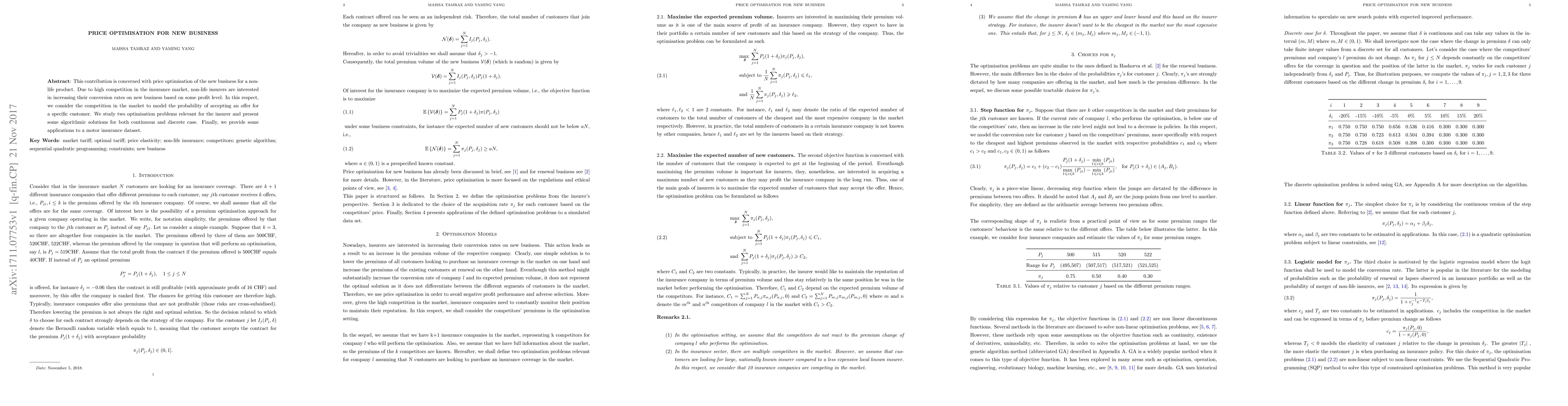 This paper explores the price optimisation for new business in the non-life insurance sector, focusing on increasing conversion rates through competitive pricing strategies. It presents algorithmic solutions for both continuous and discrete optimisation problems and applies these methods to a motor insurance dataset.