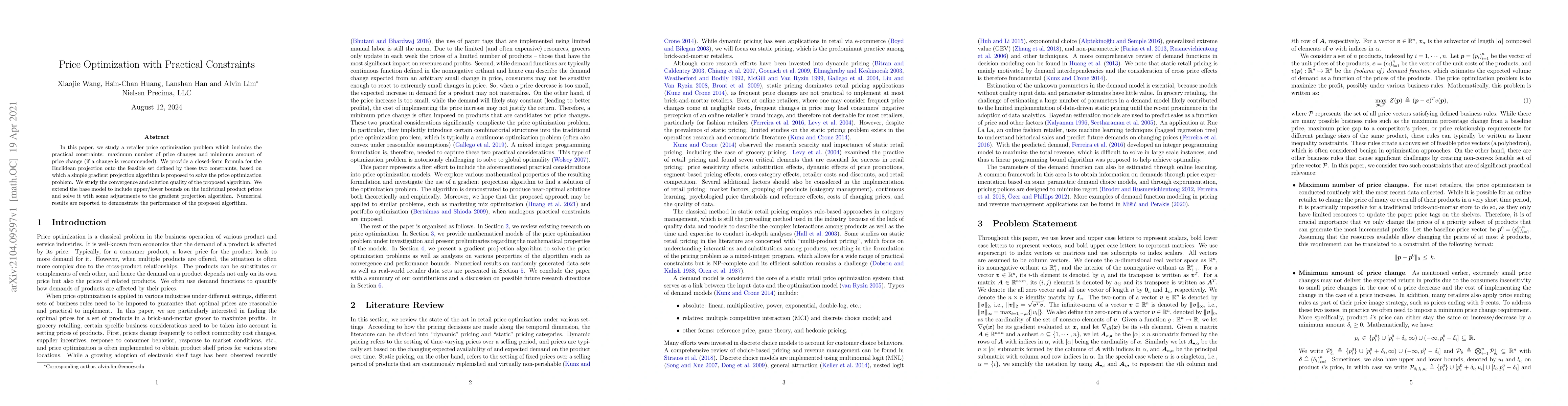 In this paper, we study a retailer price optimization problem which includes the practical constraints: maximum number of price changes and minimum amount of price change (if a change is recommended). We provide a closed-form formula for the Euclidean projection onto the feasible set defined by these two constraints, based on which a simple gradient projection algorithm is proposed to solve the price optimization problem. We study the convergence and solution quality of the proposed algorithm. We extend the base model to include upper/lower bounds on the individual product prices and solve it with some adjustments to the gradient projection algorithm. Numerical results are reported to demonstrate the performance of the proposed algorithm.