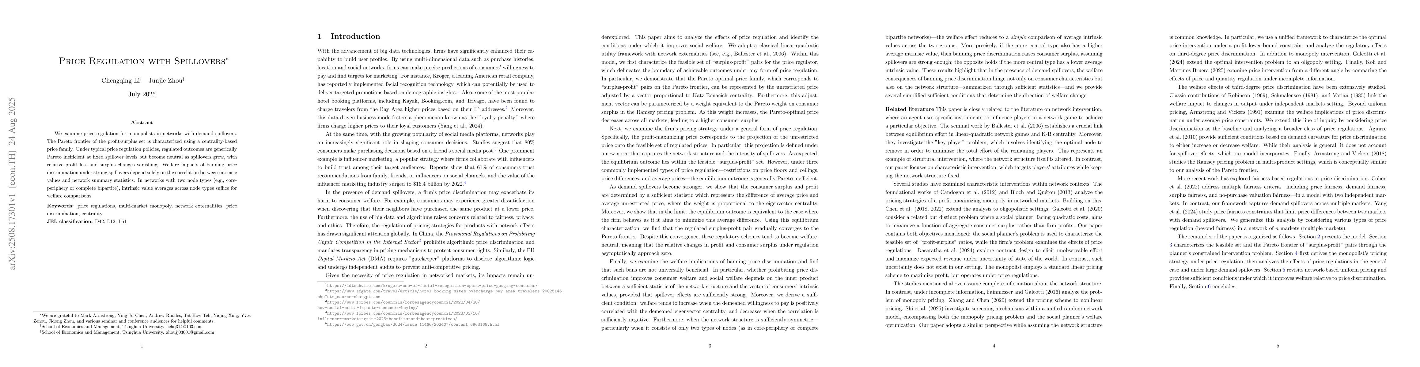 We examine price regulation for monopolists in networks with demand spillovers. The Pareto frontier of the profit-surplus set is characterized using a centrality-based price family. Under typical price regulation policies, regulated outcomes are generically Pareto inefficient at fixed spillover levels but become neutral as spillovers grow, with relative profit loss and surplus changes vanishing. Welfare impacts of banning price discrimination under strong spillovers depend solely on the correlation between intrinsic values and network summary statistics. In networks with two node types (e.g., coreperiphery or complete bipartite), intrinsic value averages across node types suffice for welfare comparisons.
