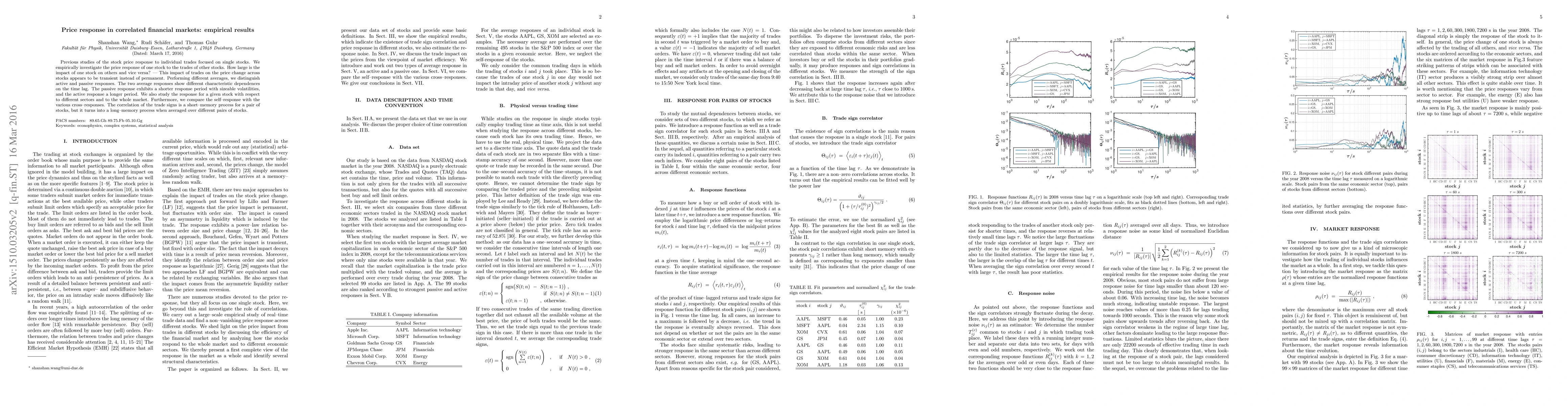 Previous studies of the stock price response to individual trades focused on single stocks. We empirically investigate the price response of one stock to the trades of other stocks. How large is the impact of one stock on others and vice versa? -- This impact of trades on the price change across stocks appears to be transient instead of permanent. Performing different averages, we distinguish active and passive responses. The two average responses show different characteristic dependences on the time lag. The passive response exhibits a shorter response period with sizeable volatilities, and the active response a longer period. We also study the response for a given stock with respect to different sectors and to the whole market. Furthermore, we compare the self-response with the various cross-responses. The correlation of the trade signs is a short-memory process for a pair of stocks, but it turns into a long-memory process when averaged over different pairs of stocks.