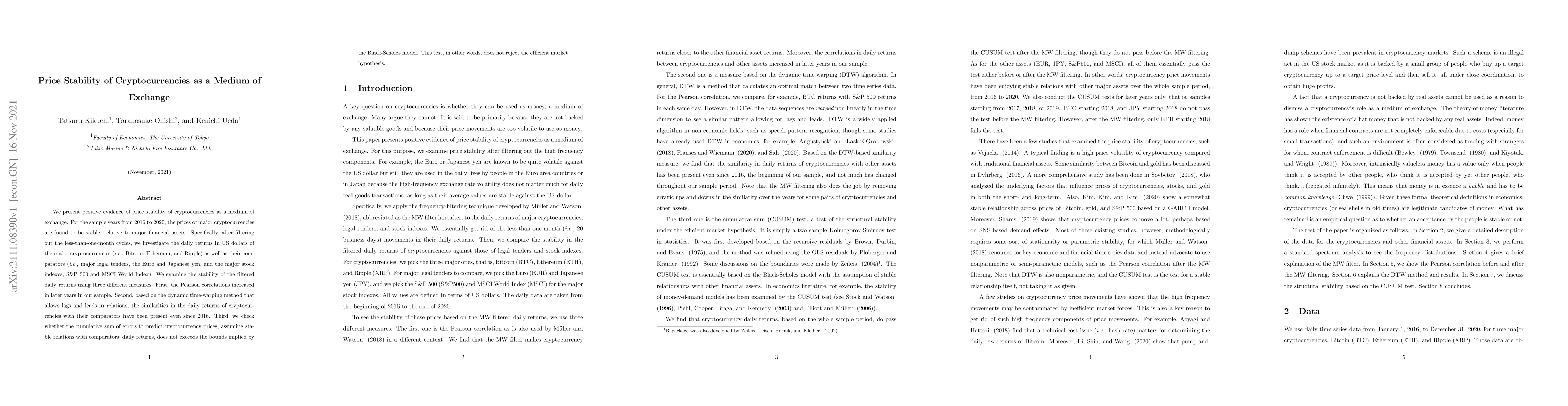 We present positive evidence of price stability of cryptocurrencies as a medium of exchange. For the sample years from 2016 to 2020, the prices of major cryptocurrencies are found to be stable, relative to major financial assets. Specifically, after filtering out the less-than-one-month cycles, we investigate the daily returns in US dollars of the major cryptocurrencies (i.e., Bitcoin, Ethereum, and Ripple) as well as their comparators (i.e., major legal tenders, the Euro and Japanese yen, and the major stock indexes, S&P 500 and MSCI World Index). We examine the stability of the filtered daily returns using three different measures. First, the Pearson correlations increased in later years in our sample. Second, based on the dynamic time-warping method that allows lags and leads in relations, the similarities in the daily returns of cryptocurrencies with their comparators have been present even since 2016. Third, we check whether the cumulative sum of errors to predict cryptocurrency prices, assuming stable relations with comparators' daily returns, does not exceeds the bounds implied by the Black-Scholes model. This test, in other words, does not reject the efficient market hypothesis.