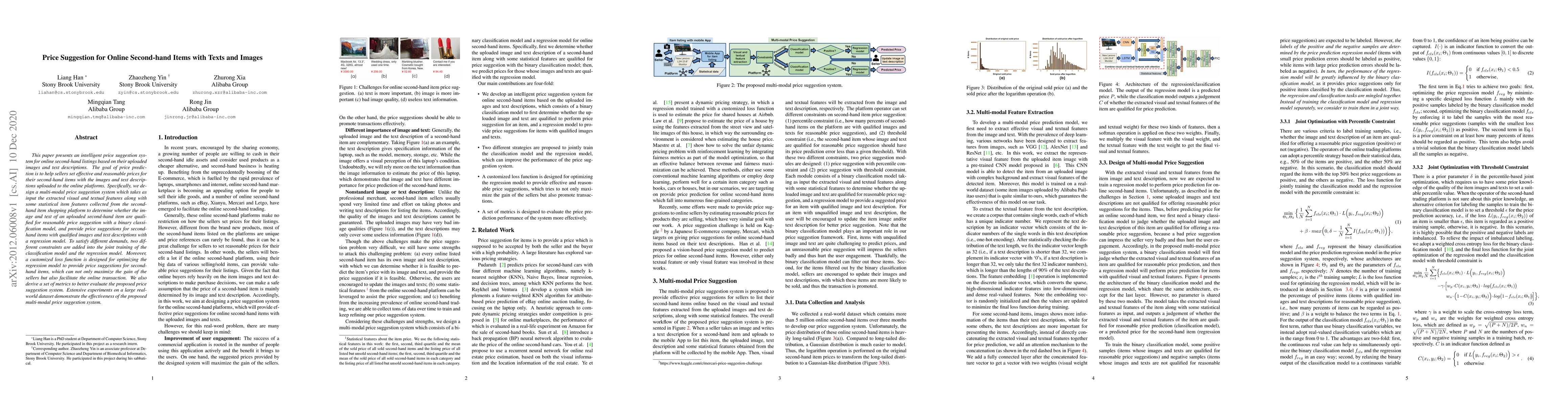 This paper presents an intelligent price suggestion system for online second-hand listings based on their uploaded images and text descriptions. The goal of price prediction is to help sellers set effective and reasonable prices for their second-hand items with the images and text descriptions uploaded to the online platforms. Specifically, we design a multi-modal price suggestion system which takes as input the extracted visual and textual features along with some statistical item features collected from the second-hand item shopping platform to determine whether the image and text of an uploaded second-hand item are qualified for reasonable price suggestion with a binary classification model, and provide price suggestions for second-hand items with qualified images and text descriptions with a regression model. To satisfy different demands, two different constraints are added into the joint training of the classification model and the regression model. Moreover, a customized loss function is designed for optimizing the regression model to provide price suggestions for second-hand items, which can not only maximize the gain of the sellers but also facilitate the online transaction. We also derive a set of metrics to better evaluate the proposed price suggestion system. Extensive experiments on a large real-world dataset demonstrate the effectiveness of the proposed multi-modal price suggestion system.