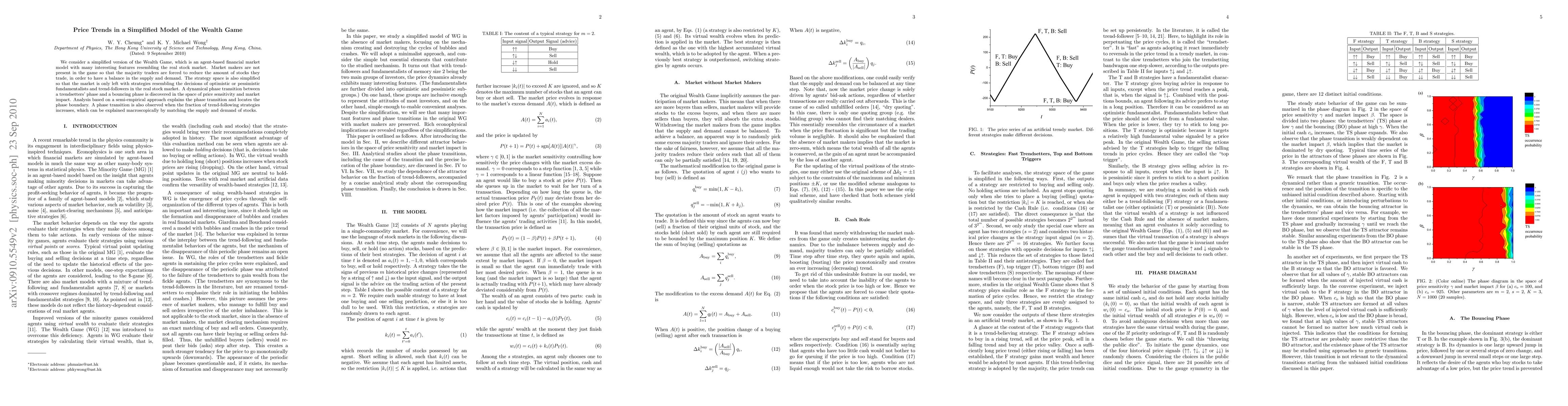 The study introduces a simplified Wealth Game model to analyze price trends, bubbles, and crashes, identifying a dynamical phase transition and deriving conditions for the disappearance of the Trend Setter phase.