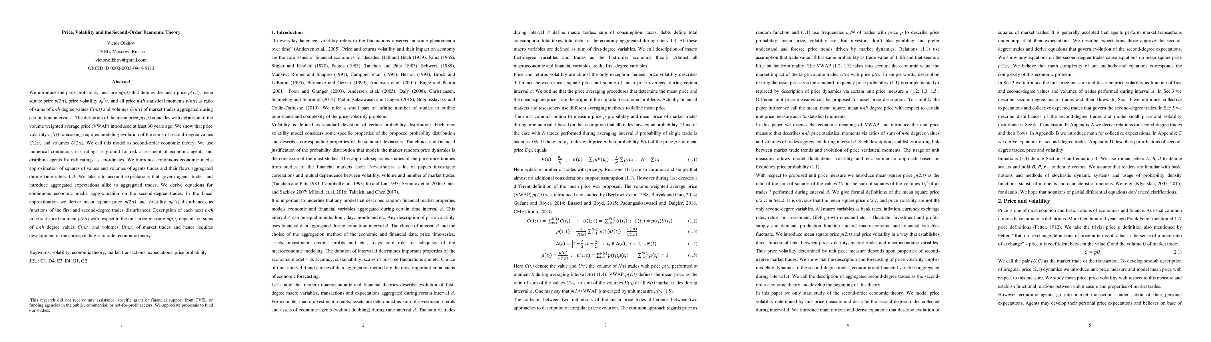 We introduce the price probability measure {\eta}(p;t) that defines the mean price p(1;t), mean square price p(2;t), price volatility {\sigma}p2(t)and all price n-th statistical moments p(n;t) as ratio of sums of n-th degree values C(n;t) and volumes U(n;t) of market trades aggregated during certain time interval {\Delta}. The definition of the mean price p(1;t) coincides with definition of the volume weighted average price (VWAP) introduced at least 30 years ago. We show that price volatility {\sigma}p2(t) forecasting requires modeling evolution of the sums of second-degree values C(2;t) and volumes U(2;t). We call this model as second-order economic theory. We use numerical continuous risk ratings as ground for risk assessment of economic agents and distribute agents by risk ratings as coordinates. We introduce continuous economic media approximation of squares of values and volumes of agents trades and their flows aggregated during time interval {\Delta}. We take into account expectations that govern agents trades and introduce aggregated expectations alike to aggregated trades. We derive equations for continuous economic media approximation on the second-degree trades. In the linear approximation we derive mean square price p(2;t) and volatility {\sigma}p2(t) disturbances as functions of the first and second-degree trades disturbances. Description of each next n-th price statistical moment p(n;t) with respect to the unit price measure {\eta}(p;t) depends on sums of n-th degree values C(n;t) and volumes U(n;t) of market trades and hence requires development of the corresponding n-th order economic theory.