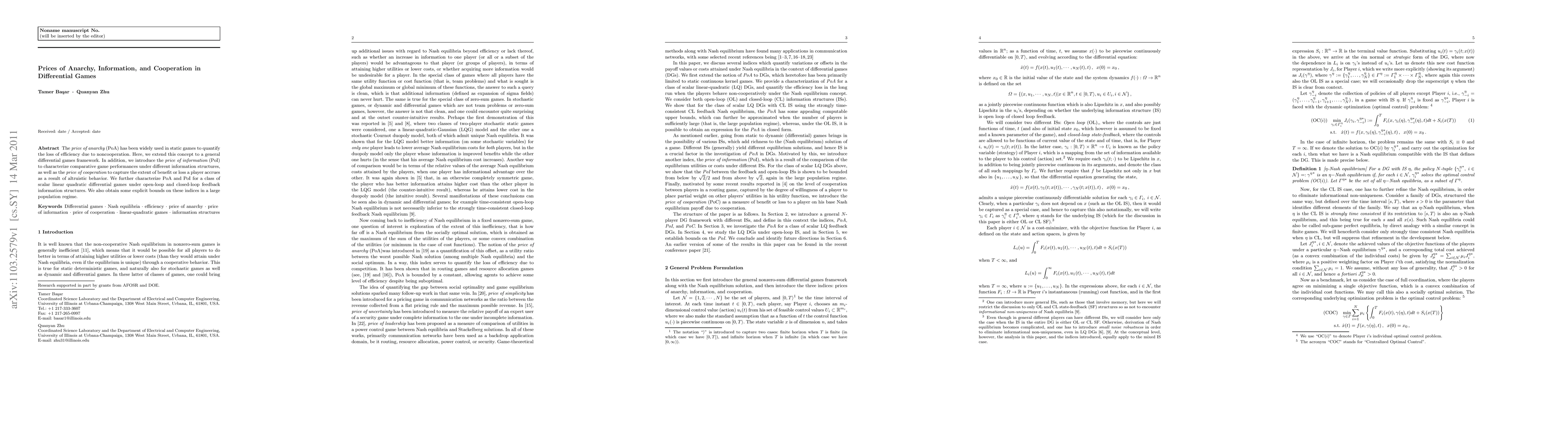 The price of anarchy (PoA) has been widely used in static games to quantify the loss of efficiency due to noncooperation. Here, we extend this concept to a general differential games framework. In addition, we introduce the price of information (PoI) to characterize comparative game performances under different information structures, as well as the price of cooperation to capture the extent of benefit or loss a player accrues as a result of altruistic behavior. We further characterize PoA and PoI for a class of scalar linear quadratic differential games under open-loop and closed-loop feedback information structures. We also obtain some explicit bounds on these indices in a large population regime.