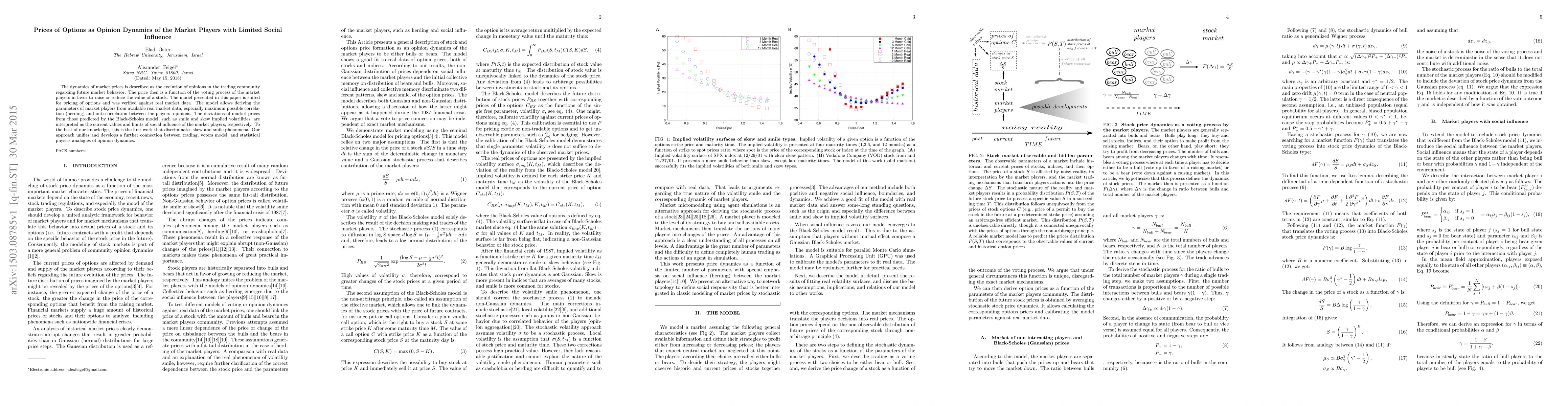 The dynamics of market prices is described as the evolution of opinions in the trading community regarding future market behavior. The price then is a function of the voting process of the market players in favor to raise or reduce the value of a stock. The model presented in this paper is suited for pricing of options and was verified against real market data. The model allows deriving the parameters of market players from available real market data, especially maximum possible correlation (herding) and anti-correlation between the players' opinions. The deviations of market prices from those predicted by the Black-Scholes model, such as smile and skew implied volatilities, are interpreted as the current values and limits of social influence of the market players, respectively. To the best of our knowledge, this is the first work that discriminates skew and smile phenomena. Our approach unifies and develops a further connection between trading, voters' model, and statistical physics analogies of opinion dynamics.