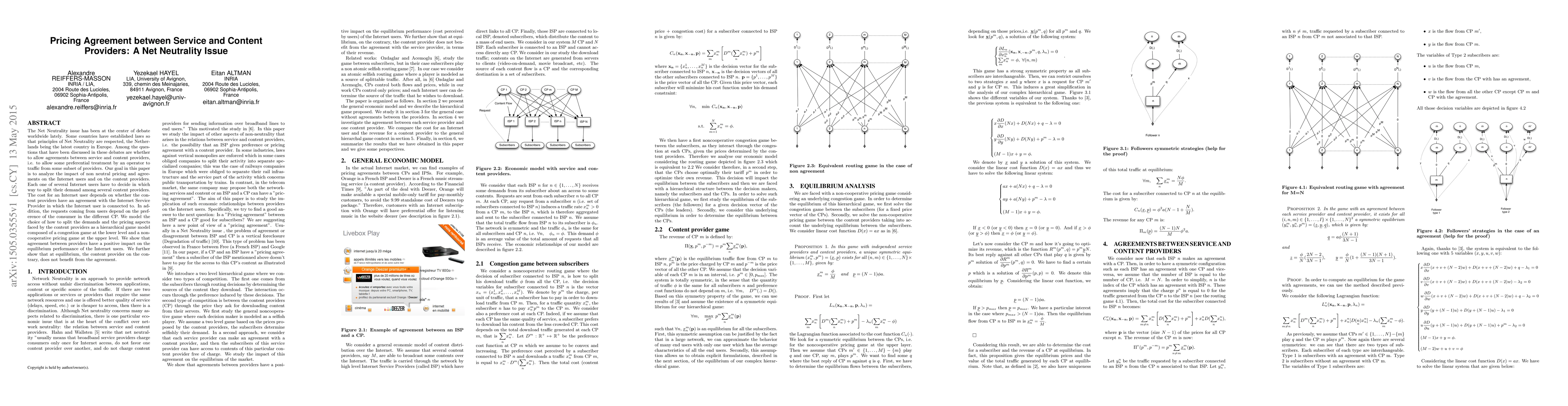 This work differs from previous studies by explicitly modeling the hierarchical structure of the Internet market, considering both congestion and pricing games, and analyzing the impact of agreements on both users and content providers.