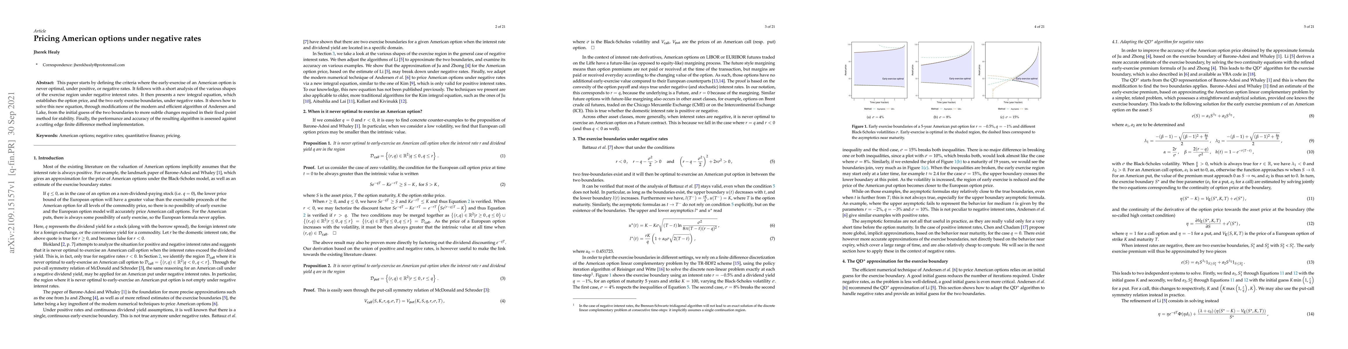 This paper starts by defining the criteria where the early-exercise of an American option is never optimal, under positive, or negative rates. It follows with a short analysis of the various shapes of the exercise region under negative interest rates. It then presents a new integral equation, which establishes the option price, and the two early exercise boundaries, under negative rates. It shows how to solve this new equation, through modifications of the modern and efficient algorithm of Andersen and Lake, from the initial guess of the two boundaries to more subtle changes required in their fixed point method for stability. Finally, the performance and accuracy of the resulting algorithm is assessed against a cutting edge finite difference method implementation.