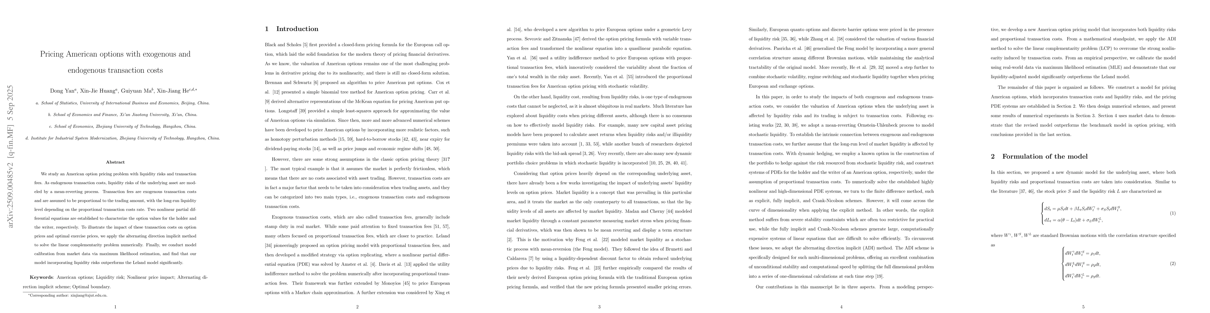 We study an American option pricing problem with liquidity risks and transaction fees. As endogenous transaction costs, liquidity risks of the underlying asset are modeled by a mean-reverting process. Transaction fees are exogenous transaction costs and are assumed to be proportional to the trading amount, with the long-run liquidity level depending on the proportional transaction costs rate. Two nonlinear partial differential equations are established to characterize the option values for the holder and the writer, respectively. To illustrate the impact of these transaction costs on option prices and optimal exercise prices, we apply the alternating direction implicit method to solve the linear complementarity problem numerically. Finally, we conduct model calibration from market data via maximum likelihood estimation, and find that our model incorporating liquidity risks outperforms the Leland model significantly.