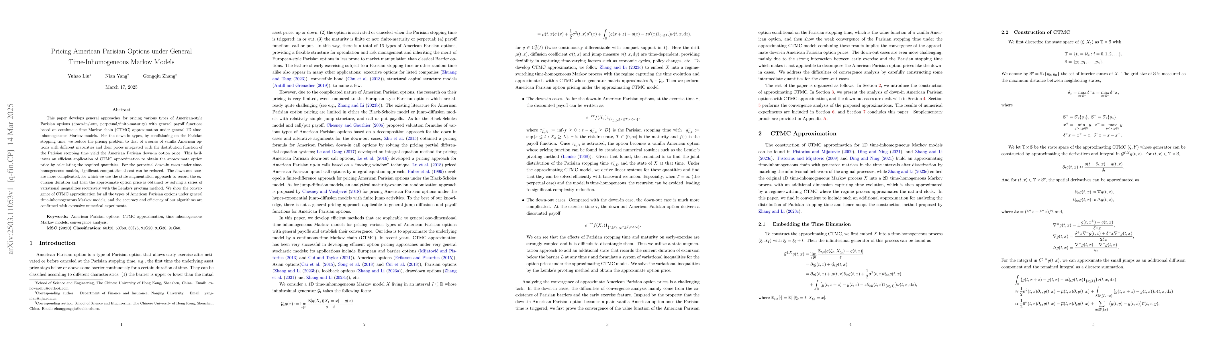 The paper develops general approaches for pricing American-style Parisian options using continuous-time Markov chain (CTMC) approximation under general 1D time-inhomogeneous Markov models.