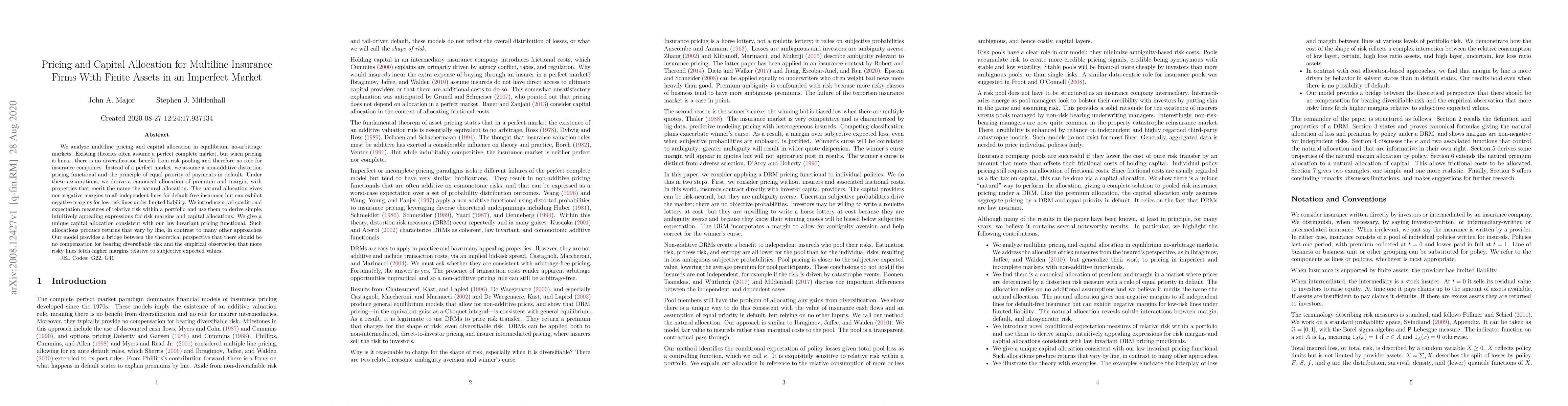 This paper examines multiline insurance pricing and capital allocation in imperfect markets, deriving a "natural allocation" that provides non-negative margins for default-free lines but can yield negative margins for low-risk lines under limited liability. It introduces novel risk measures to derive capital allocations that vary by line, bridging theoretical and empirical observations on risk compensation.