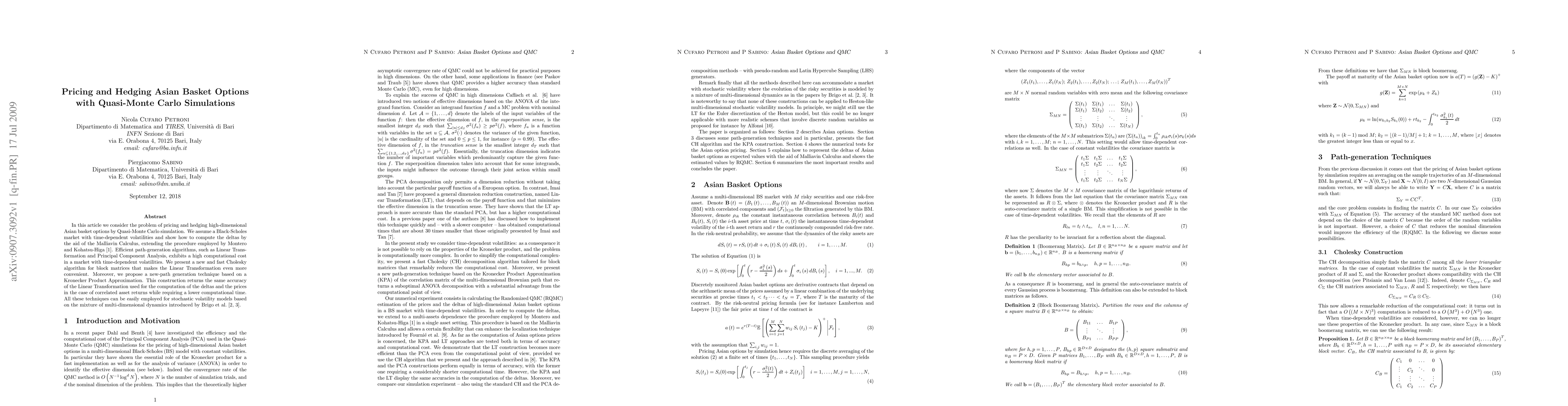This paper proposes efficient Quasi-Monte Carlo simulation methods for pricing and hedging high-dimensional Asian basket options, introducing a new Cholesky algorithm and a Kronecker Product Approximation technique to reduce computational costs while maintaining accuracy.