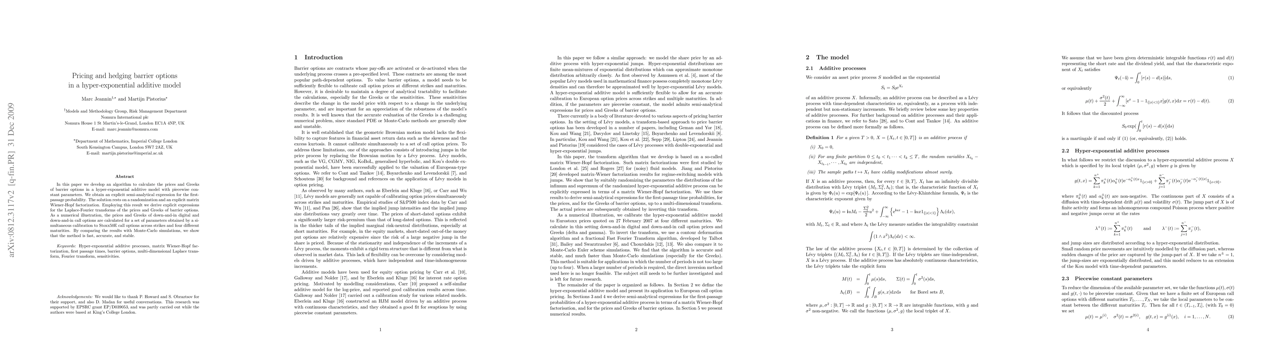 This paper develops an algorithm for pricing and hedging barrier options using a hyper-exponential additive model with piecewise constant parameters. It provides explicit semi-analytical expressions for the first-passage probability and the Laplace-Fourier transforms of barrier option prices and Greeks, demonstrating accuracy and stability through calibration and comparison with Monte-Carlo simulations.