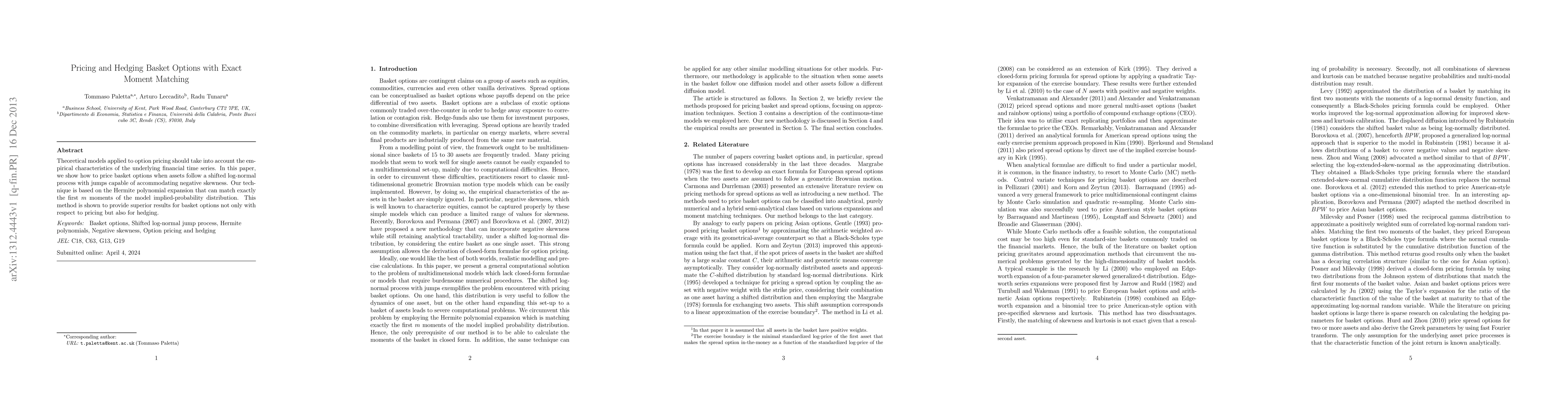 This paper presents a method for pricing and hedging basket options using a shifted log-normal process with jumps, employing Hermite polynomial expansion to match the first m moments of the implied probability distribution, resulting in superior pricing and hedging performance.