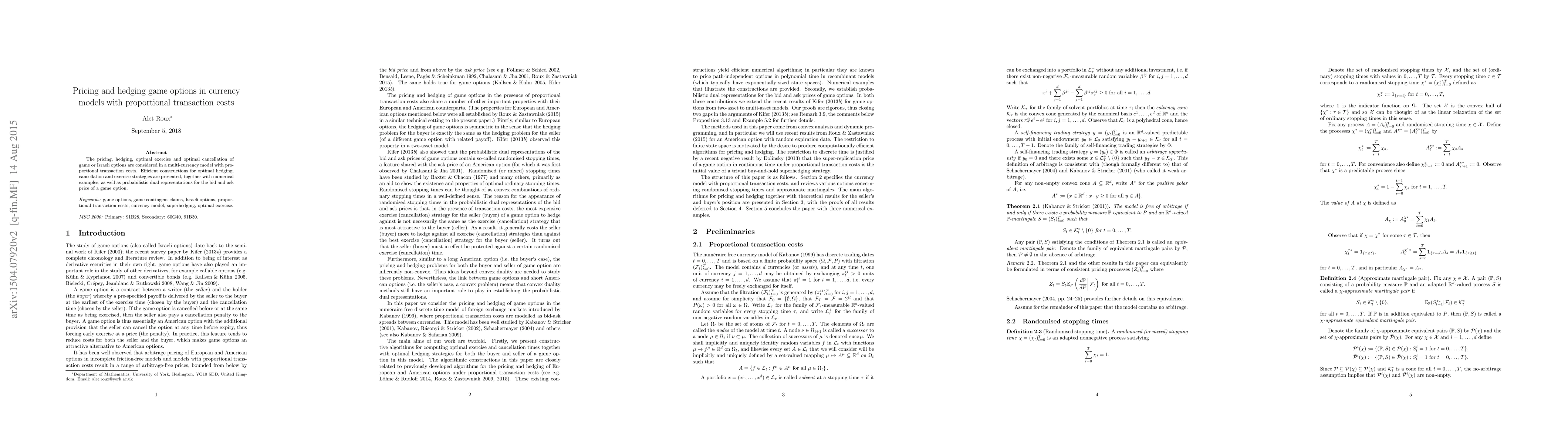 This paper explores the pricing and hedging of game or Israeli options in a multi-currency model with proportional transaction costs, providing efficient strategies for optimal exercise and cancellation, along with numerical examples and probabilistic dual representations for option prices.
