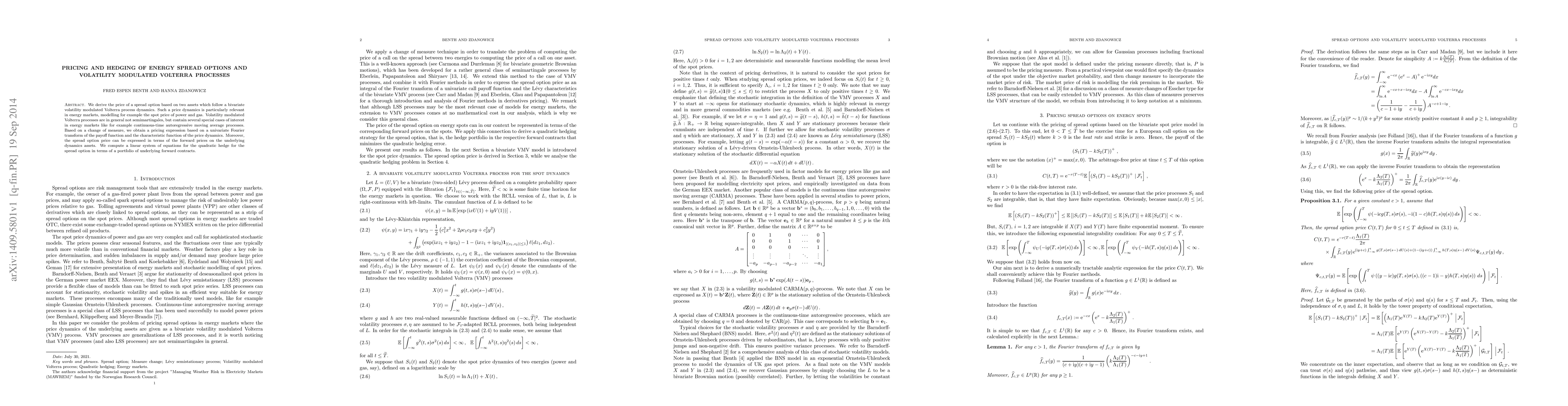 This paper derives the pricing formula for spread options based on two energy assets modeled by a bivariate volatility modulated Volterra process. It provides a pricing expression using a Fourier transform and characteristic function, and computes a linear system for the quadratic hedge in terms of underlying forward contracts.