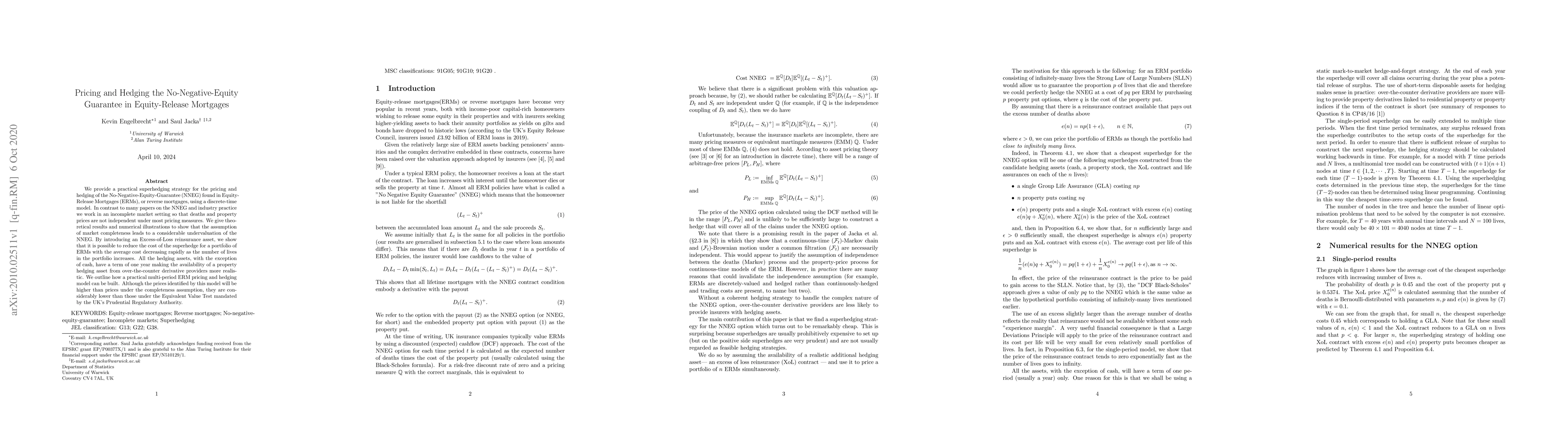 We provide a practical superhedging strategy for the pricing and hedging of the No-Negative-Equity-Guarantee (NNEG) found in Equity-Release Mortgages (ERMs), or reverse mortgages, using a discrete-time model. In contrast to many papers on the NNEG and industry practice we work in an incomplete market setting so that deaths and property prices are not independent under most pricing measures. We give theoretical results and numerical illustrations to show that the assumption of market completeness leads to a considerable undervaluation of the NNEG. By introducing an Excess-of-Loss reinsurance asset, we show that it is possible to reduce the cost of the superhedge for a portfolio of ERMs with the average cost decreasing rapidly as the number of lives in the portfolio increases. All the hedging assets, with the exception of cash, have a term of one year making the availability of a property hedging asset from over-the-counter derivative providers more realistic. We outline how a practical multi-period ERM pricing and hedging model can be built. Although the prices identified by this model will be higher than prices under the completeness assumption, they are considerably lower than those under the Equivalent Value Test mandated by the UK's Prudential Regulatory Authority.