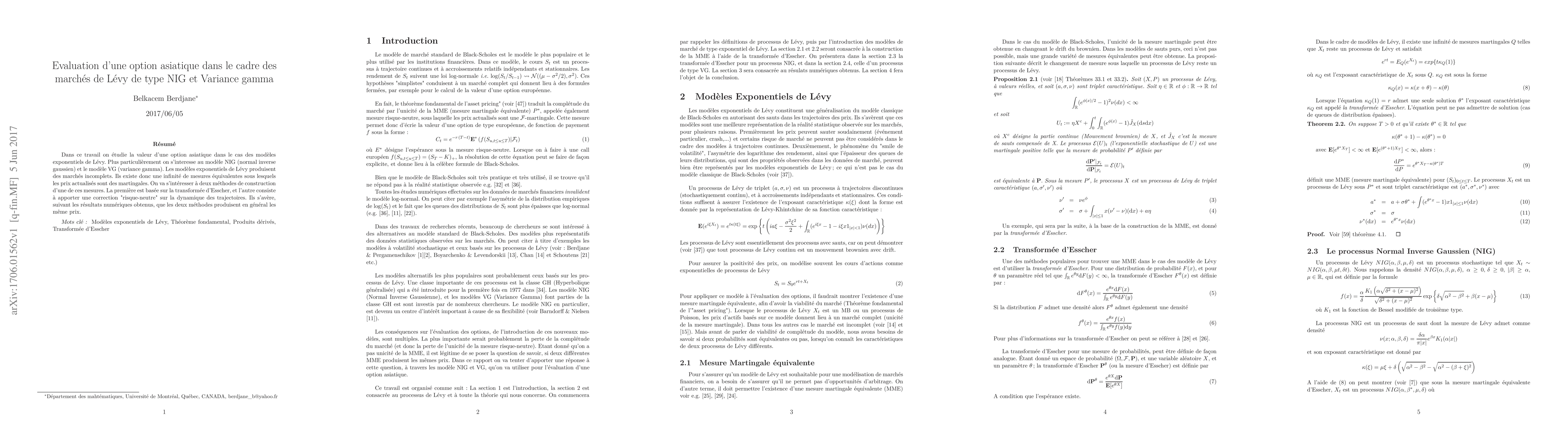 In this work, we study the value of an Asian option in the case of exponential Levy markets. More specifically, we are interested in the NIG (normal inverse Gaussian) the VG (variance gamma) models. The exponential Levy models produce incomplete markets. There are therefore an infinite number of equivalent martingale measures. We are interested in two methods of constructing of the risk-neutral measures. The first is based on the Esscher transform, and the other consists of bringing a risk-neutral correction on the dynamics of the trajectories. It turns out, according to the numerical results obtained, that the two methods generally produce the same prices.