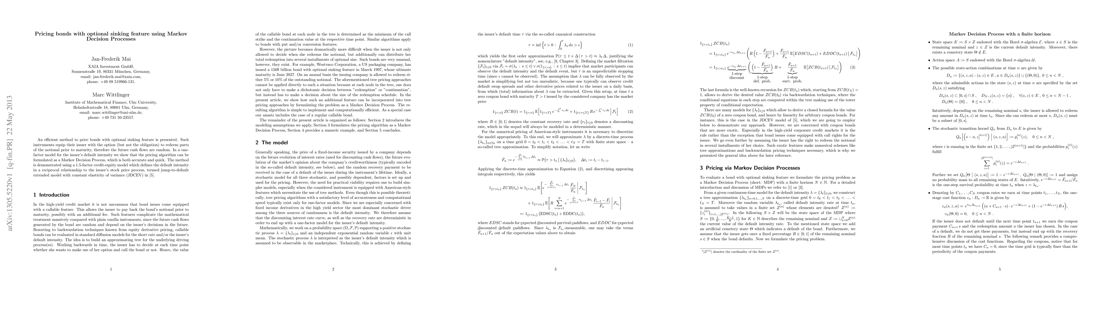 This paper presents an efficient pricing method for bonds with optional sinking features using Markov Decision Processes. The method accurately and quickly prices these bonds by modeling the issuer's default intensity in a 1.5-factor credit-equity model, specifically the JDCEV model.