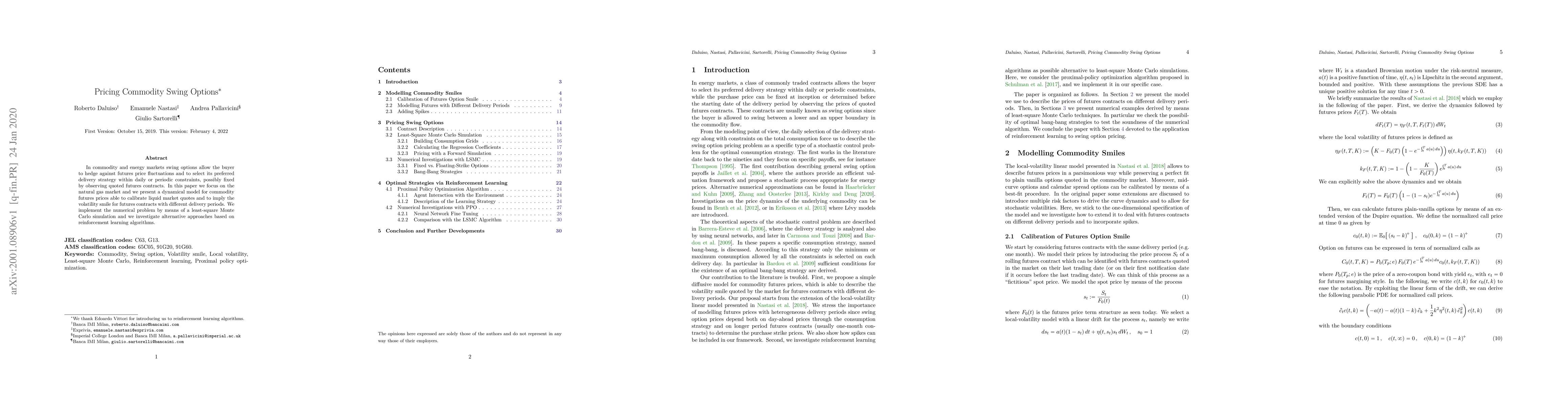 In commodity and energy markets swing options allow the buyer to hedge against futures price fluctuations and to select its preferred delivery strategy within daily or periodic constraints, possibly fixed by observing quoted futures contracts. In this paper we focus on the natural gas market and we present a dynamical model for commodity futures prices able to calibrate liquid market quotes and to imply the volatility smile for futures contracts with different delivery periods. We implement the numerical problem by means of a least-square Monte Carlo simulation and we investigate alternative approaches based on reinforcement learning algorithms.