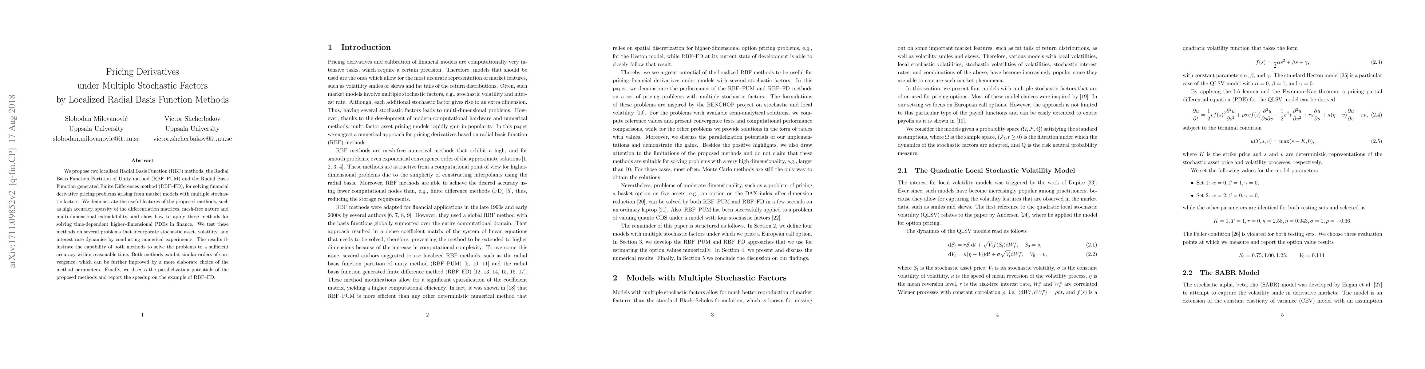 This paper introduces two localized Radial Basis Function methods—RBF-PUM and RBF-FD—for pricing financial derivatives under multiple stochastic factors. The methods demonstrate high accuracy, sparse differentiation matrices, and multi-dimensional applicability, and show promising results in numerical experiments.